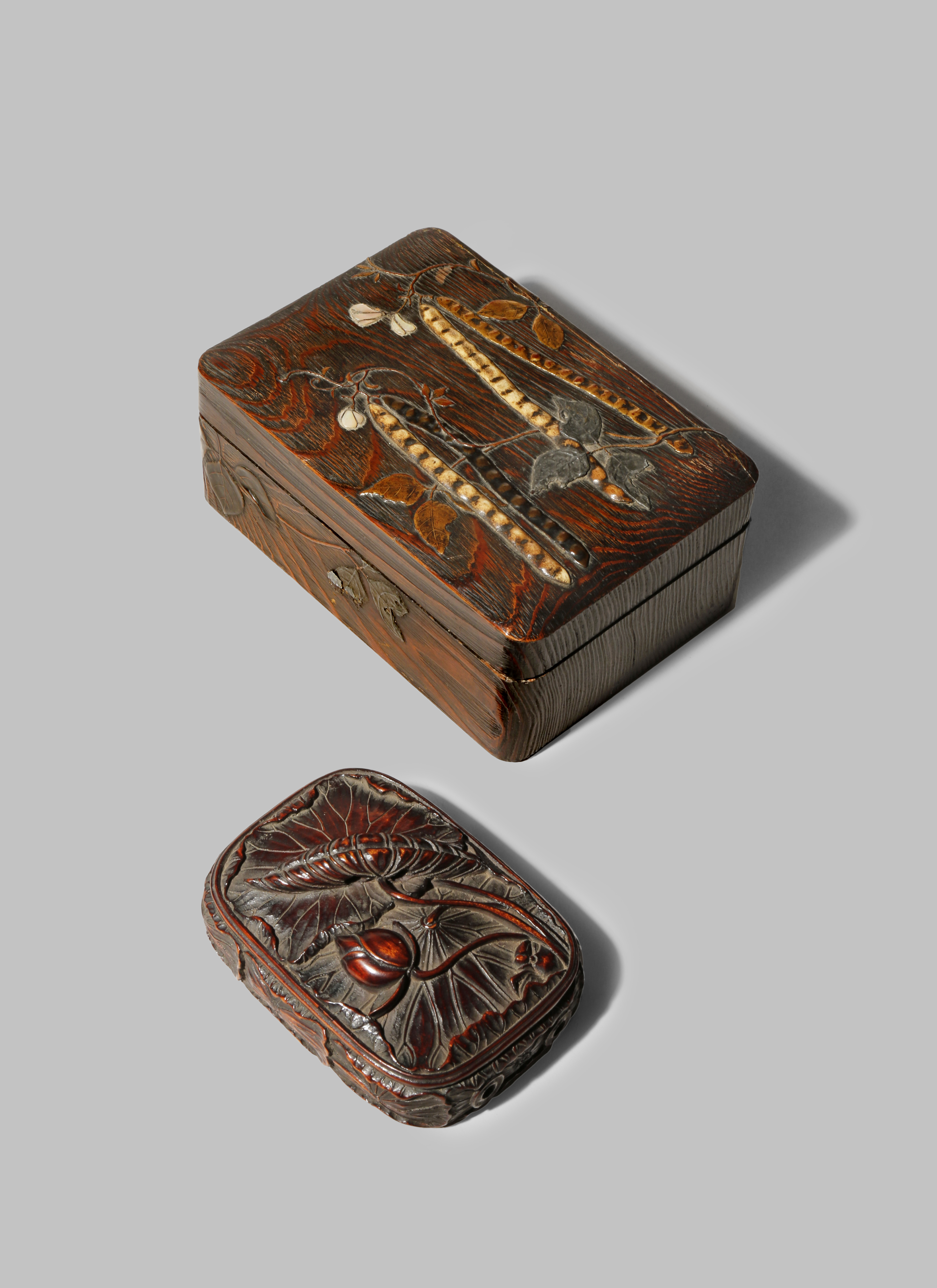 A JAPANESE WOOD INK CASE EDO/MEIJI PERIODS The lid and body decorated with lotus leaves and a bud