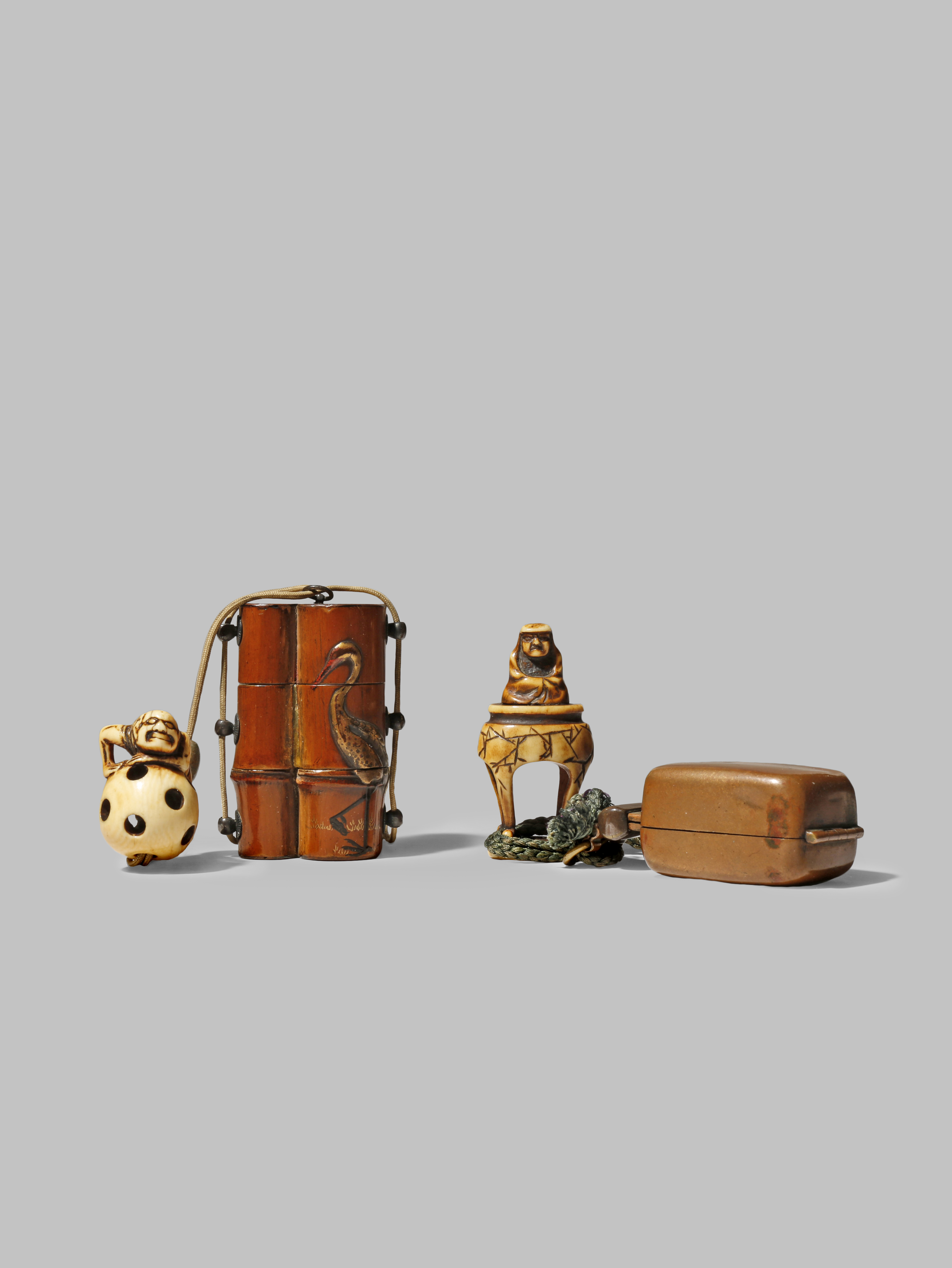 With cranes depicted on a section of bamboo, with an ivory netsuke depicting a man leaning above a large holed ball, together with a small tinder box with a stag antler netsuke carved as a Daruma doll on a four-legged stand, all unsigned, 5.7cm max. (2)