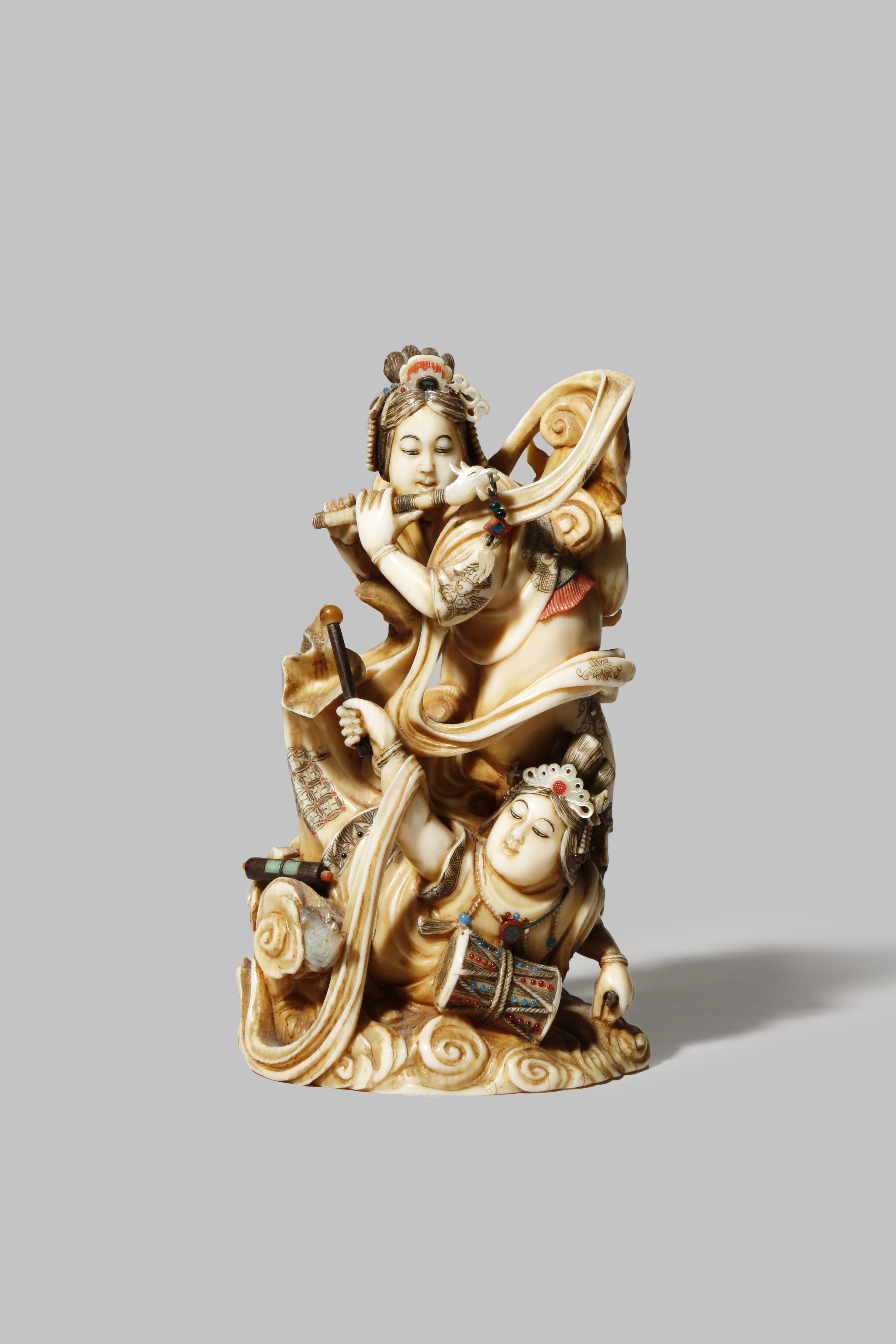 A JAPANESE IVORY OKIMONO MEIJI 1868-1912 Depicting two celestial beings (tennin) floating amongst...