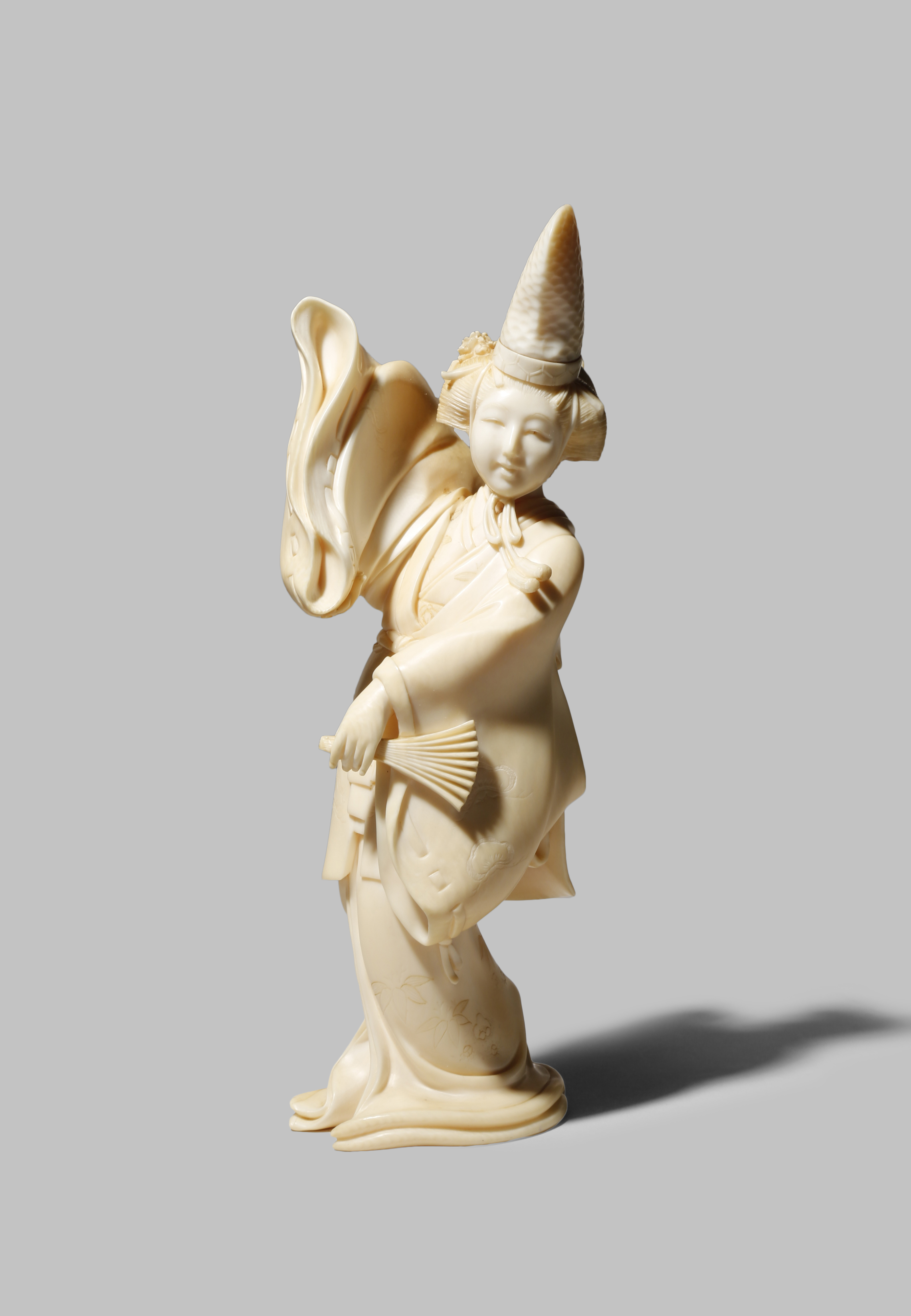 A JAPANESE IVORY OKIMONO MEIJI 1868-1912 Depicting a bijin dancing with a fan and wearing an...