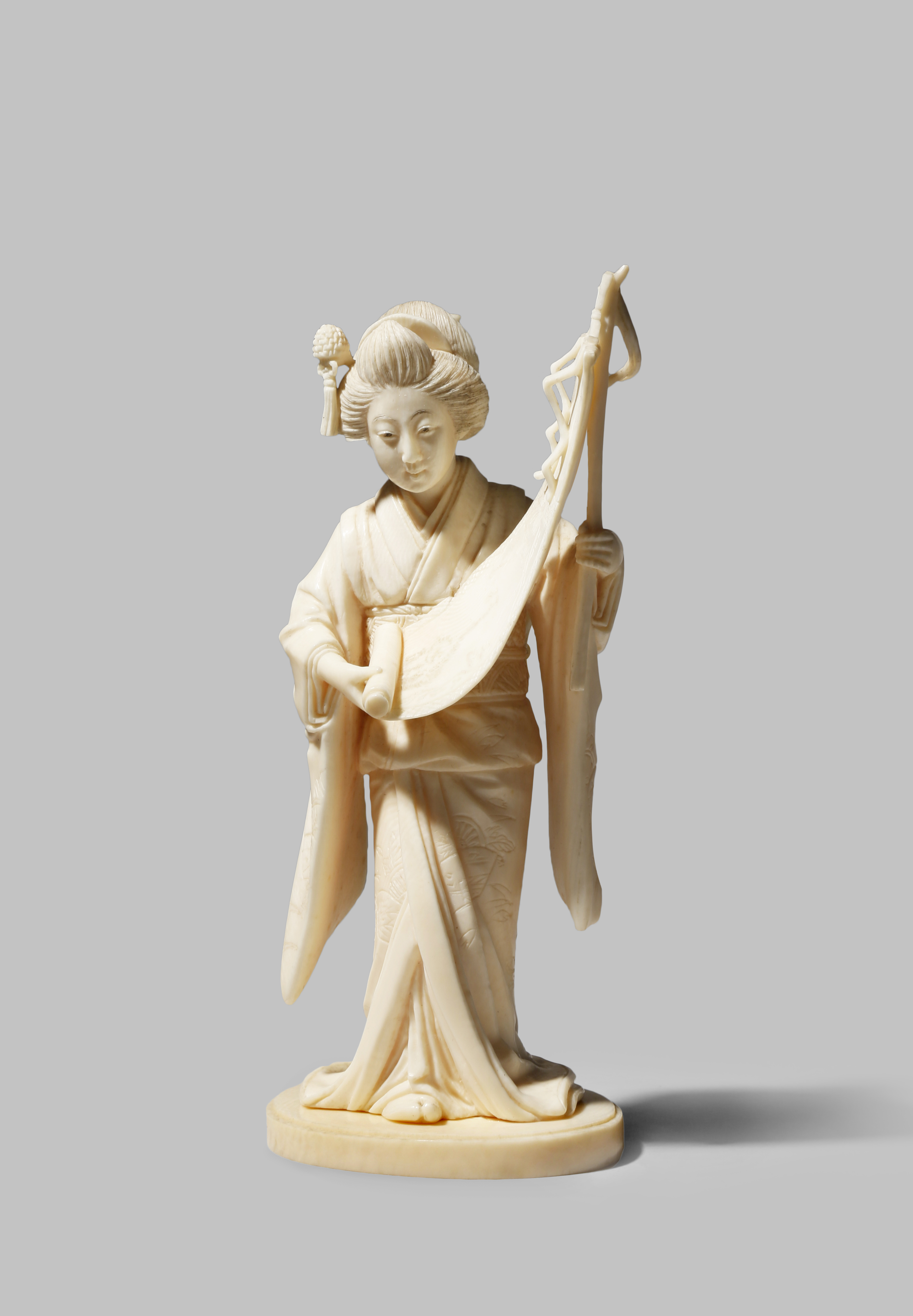 A JAPANESE IVORY OKIMONO MEIJI 1868-1912 Carved as a bijin examining a kakemono (scroll)...