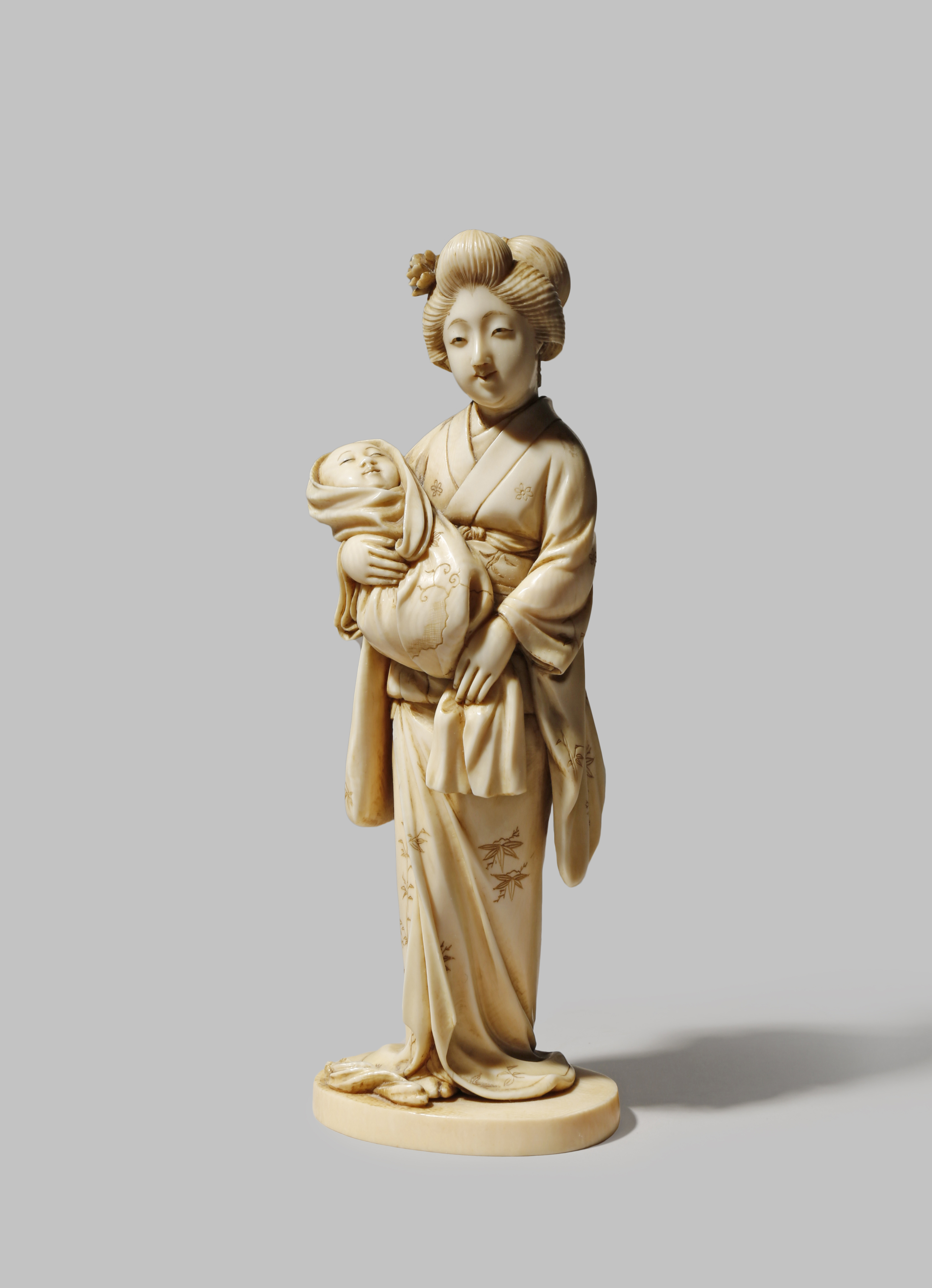 Depicting a bijin wearing long robes and carrying a small swaddled baby, the base signed Mitsuyama / Kozan, a paper label underneath reading 'Given by W.H. Carnegie to Mary E. Carnegie in memory of all the family's babies', 19cm.