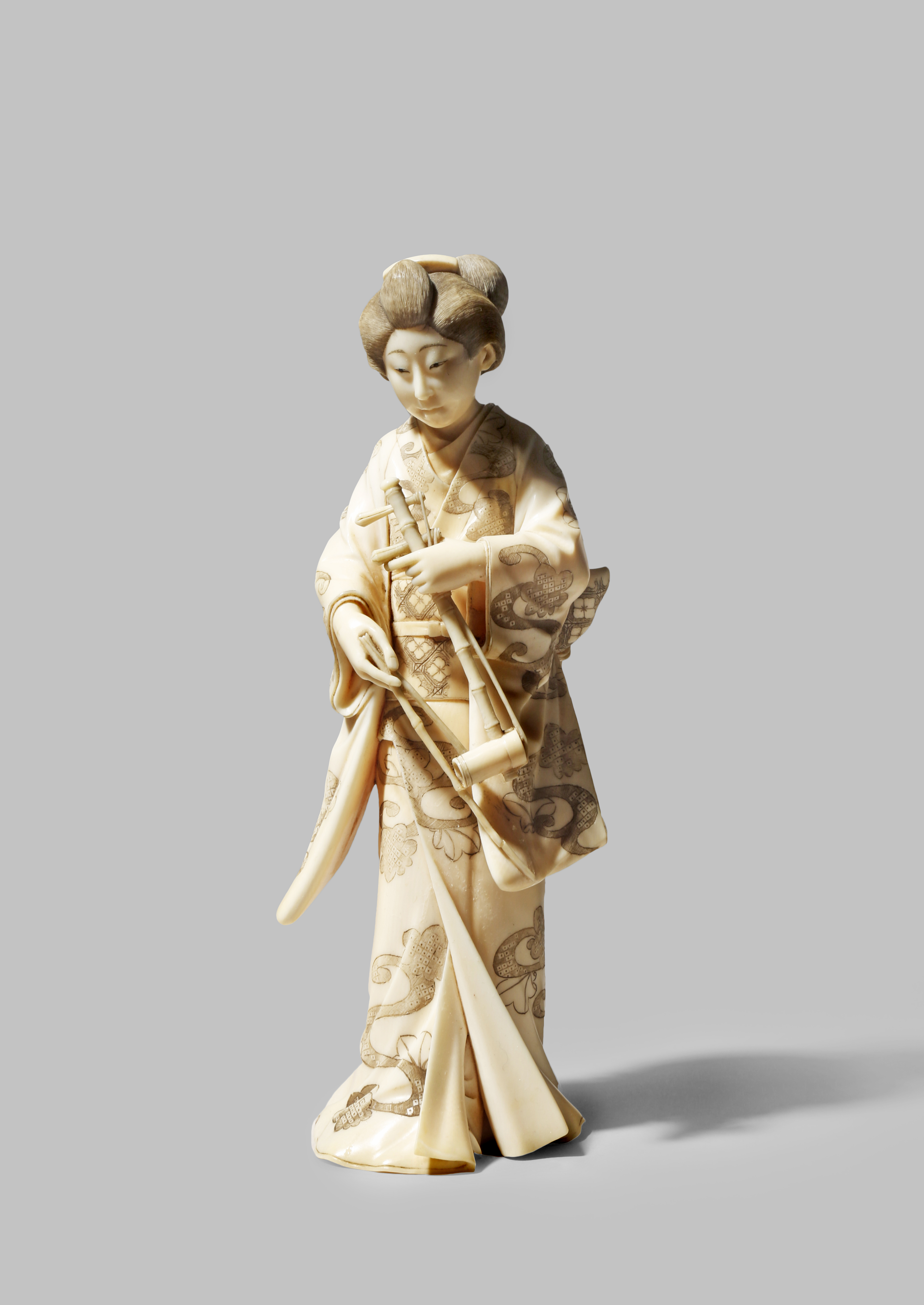 A JAPANESE IVORY OKIMONO MEIJI 1868-1912 Carved as a bijin holding a kokyu (string instrument)