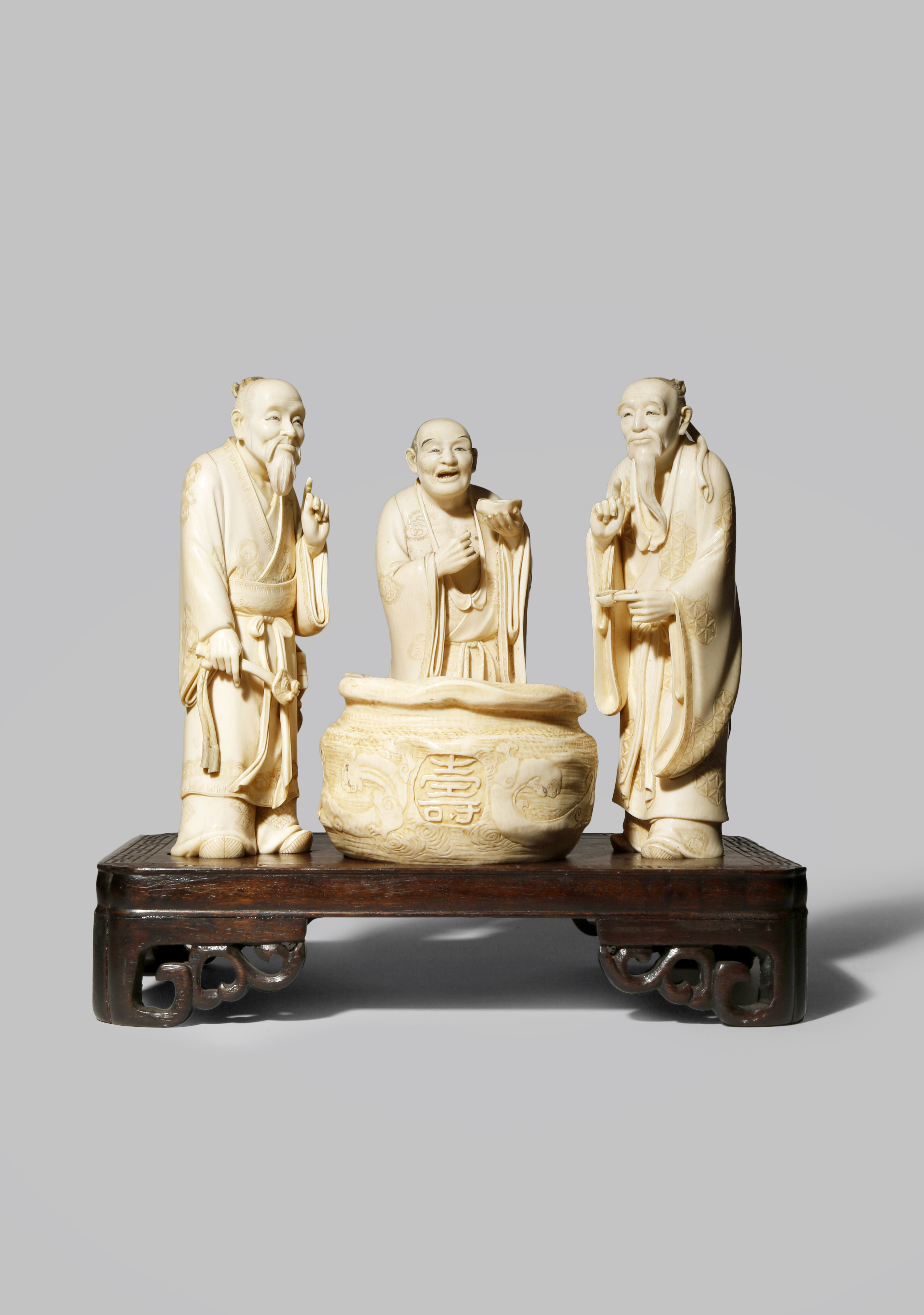A JAPANESE IVORY OKIMONO MEIJI 1868-1912 Depicting three sake tasters standing around a large jar
