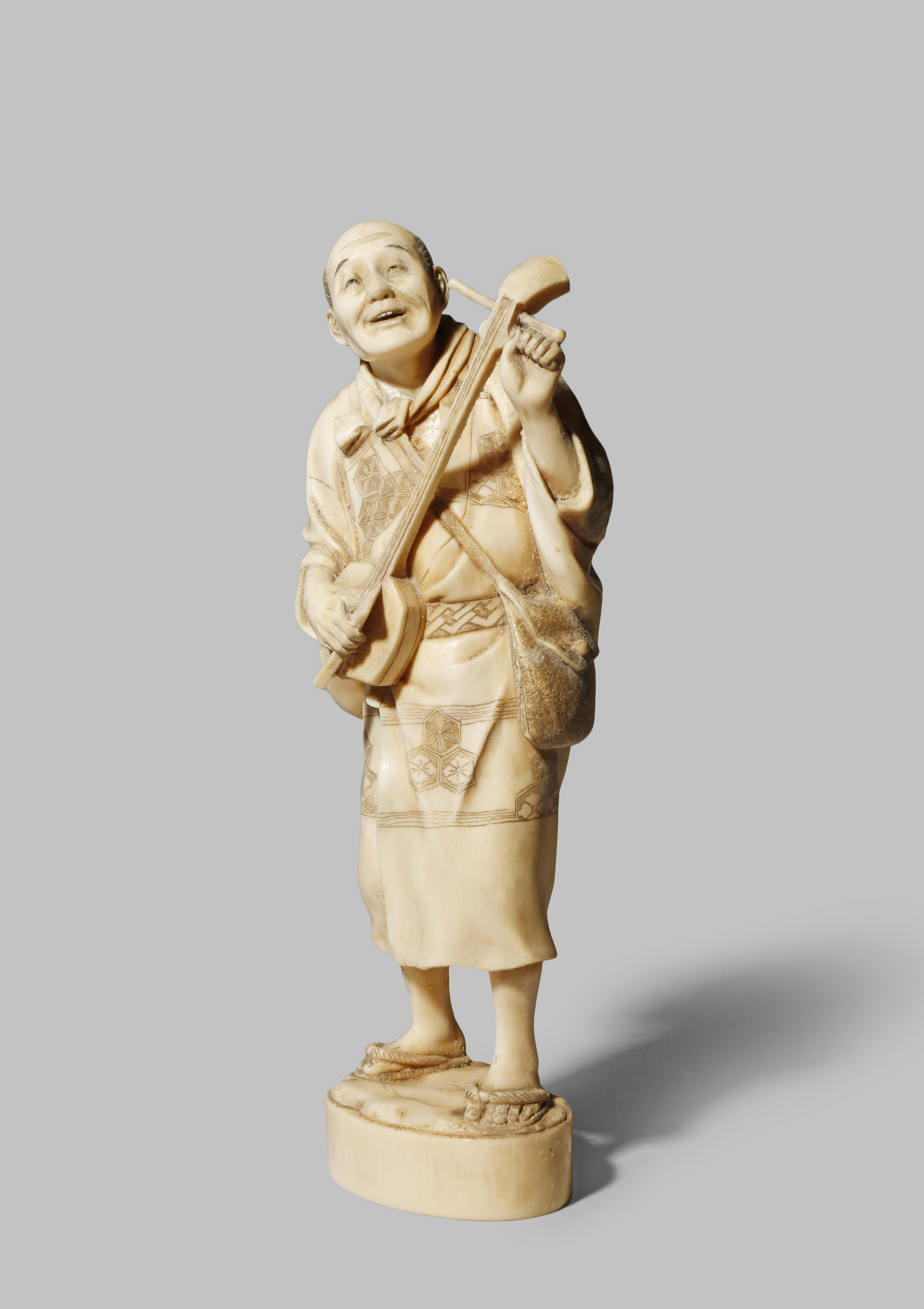 A JAPANESE IVORY OKIMONO MEIJI 1868-1912 Carved as a musician tuning his shamisen
