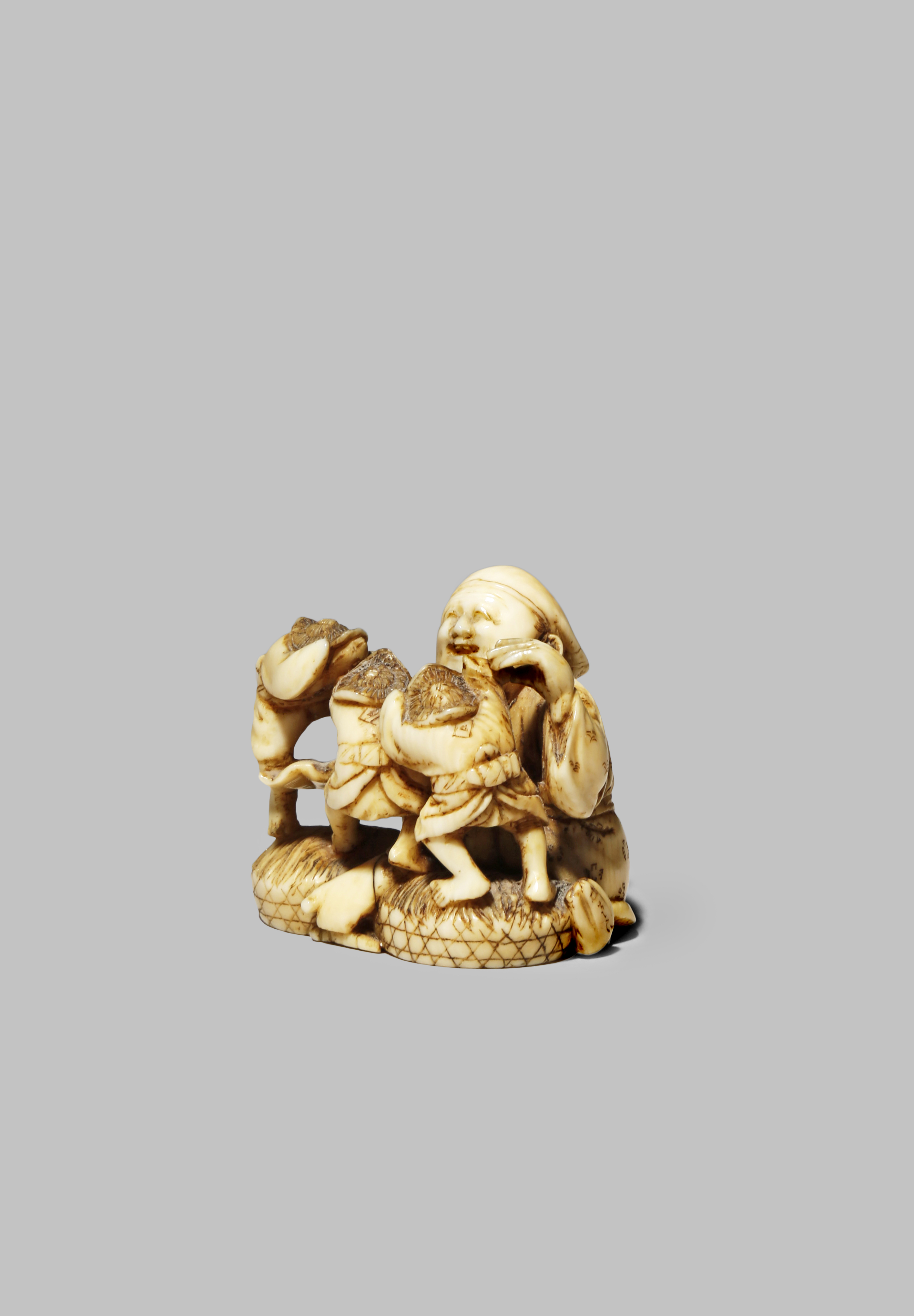 A JAPANESE IVORY NETSUKE MEIJI 1868-1912 Carved as a man seated with three small dressed-up kappa...