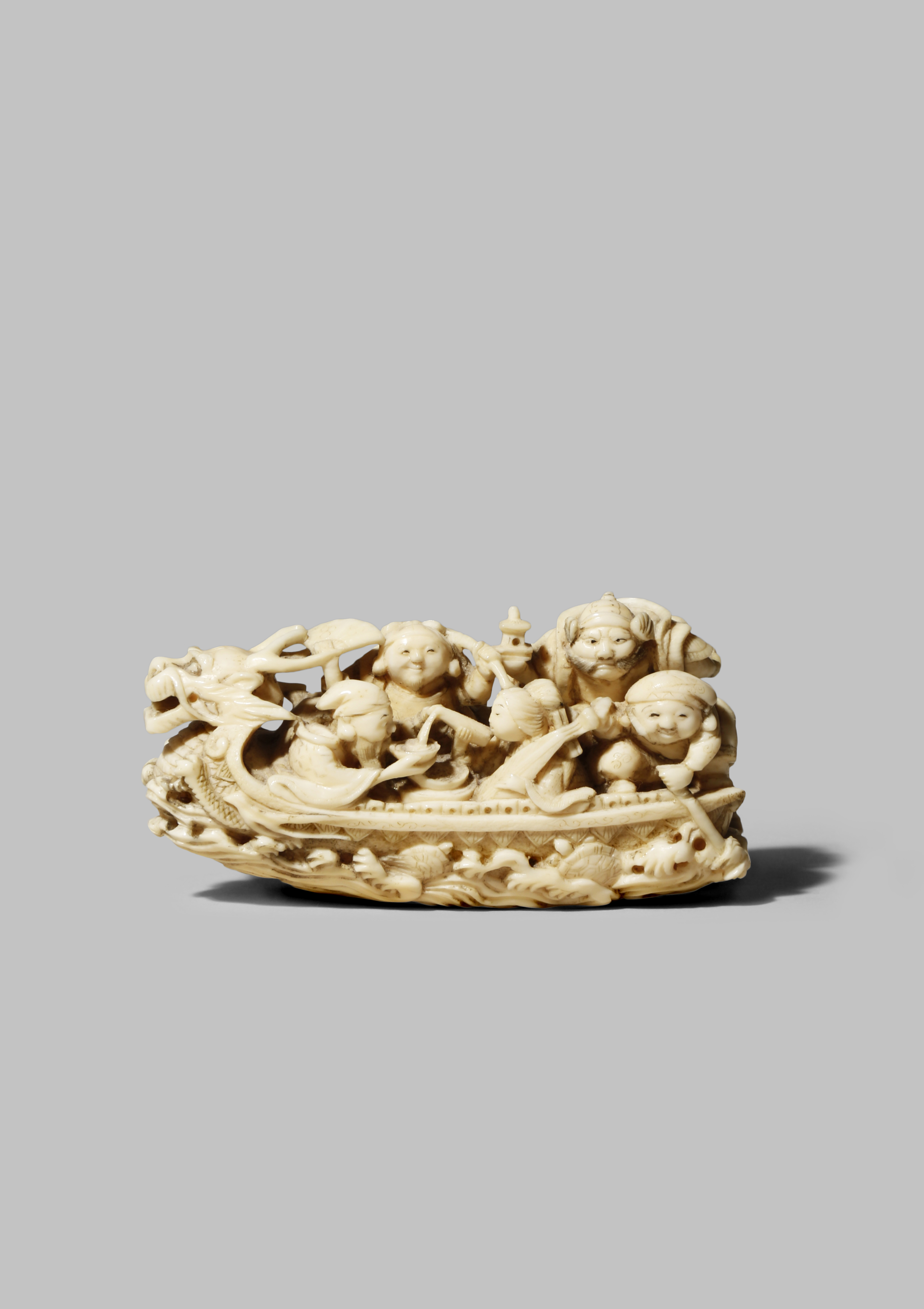 A JAPANESE IVORY OKIMONO NETSUKE MEIJI 1868-1912 Depicting the Treasure Boat