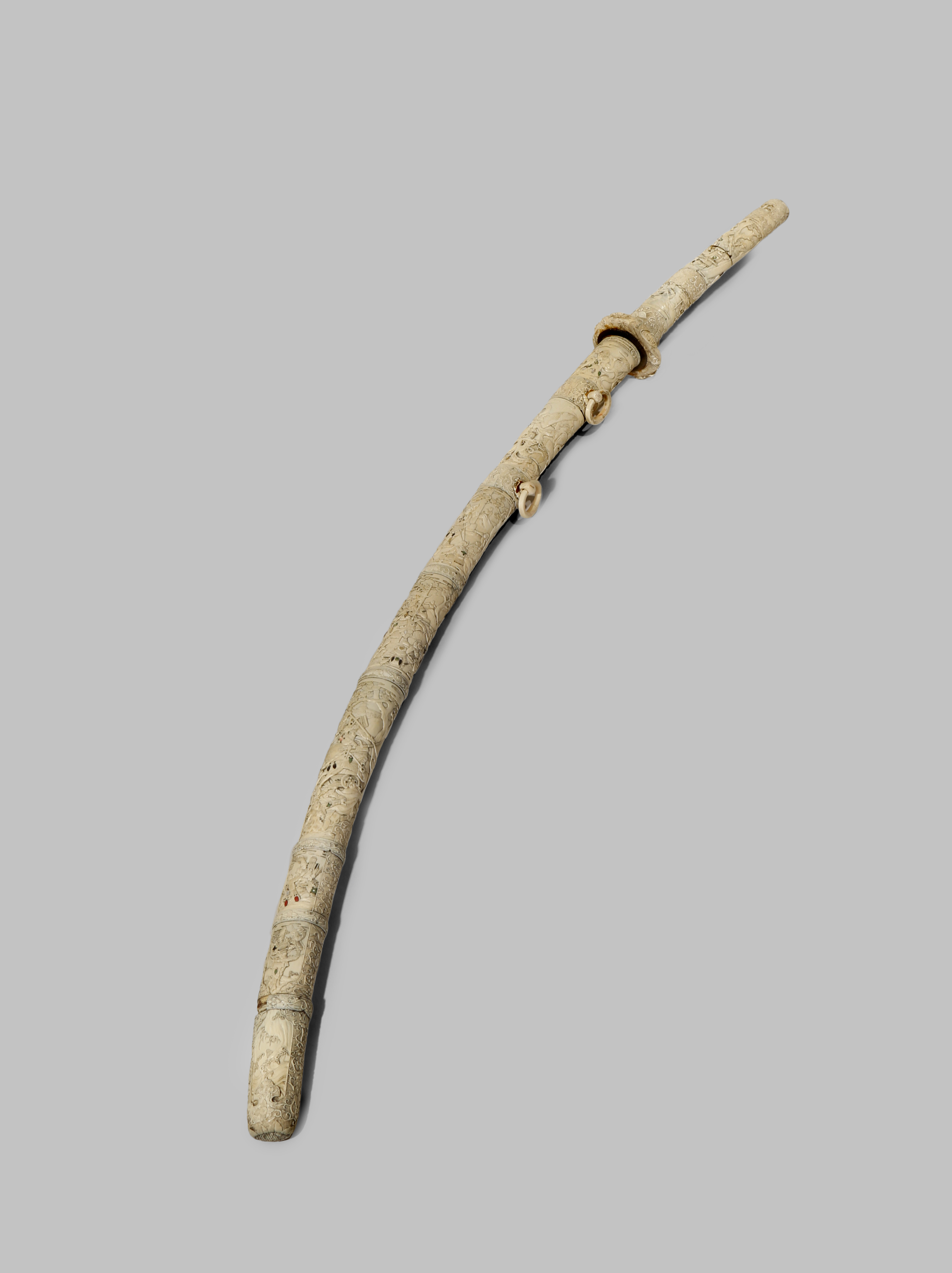 The scabbard and mounts carved in low-relief with continuous scenes of warriors engaged in battle, tennin playing musical instruments and panels of karakusa scrolls, with some details inlaid with mother of pearl, stained ivory, horn, and small metal beads, signed and with the blade inscribed, 142cm. (2)