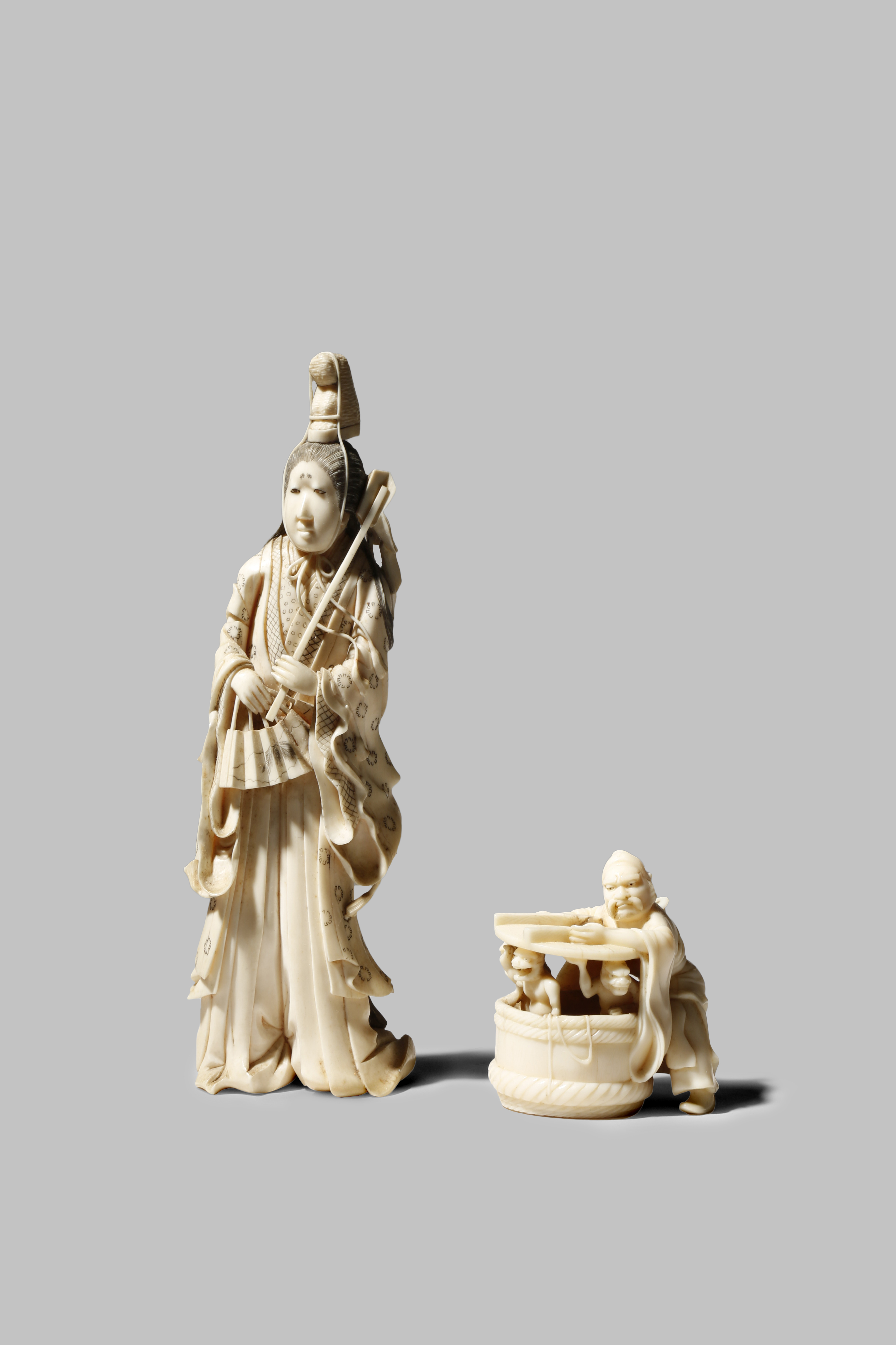TWO JAPANESE IVORY OKIMONO MEIJI 1868-1912 One depicting a tall Shinto priestess holding a wooden...