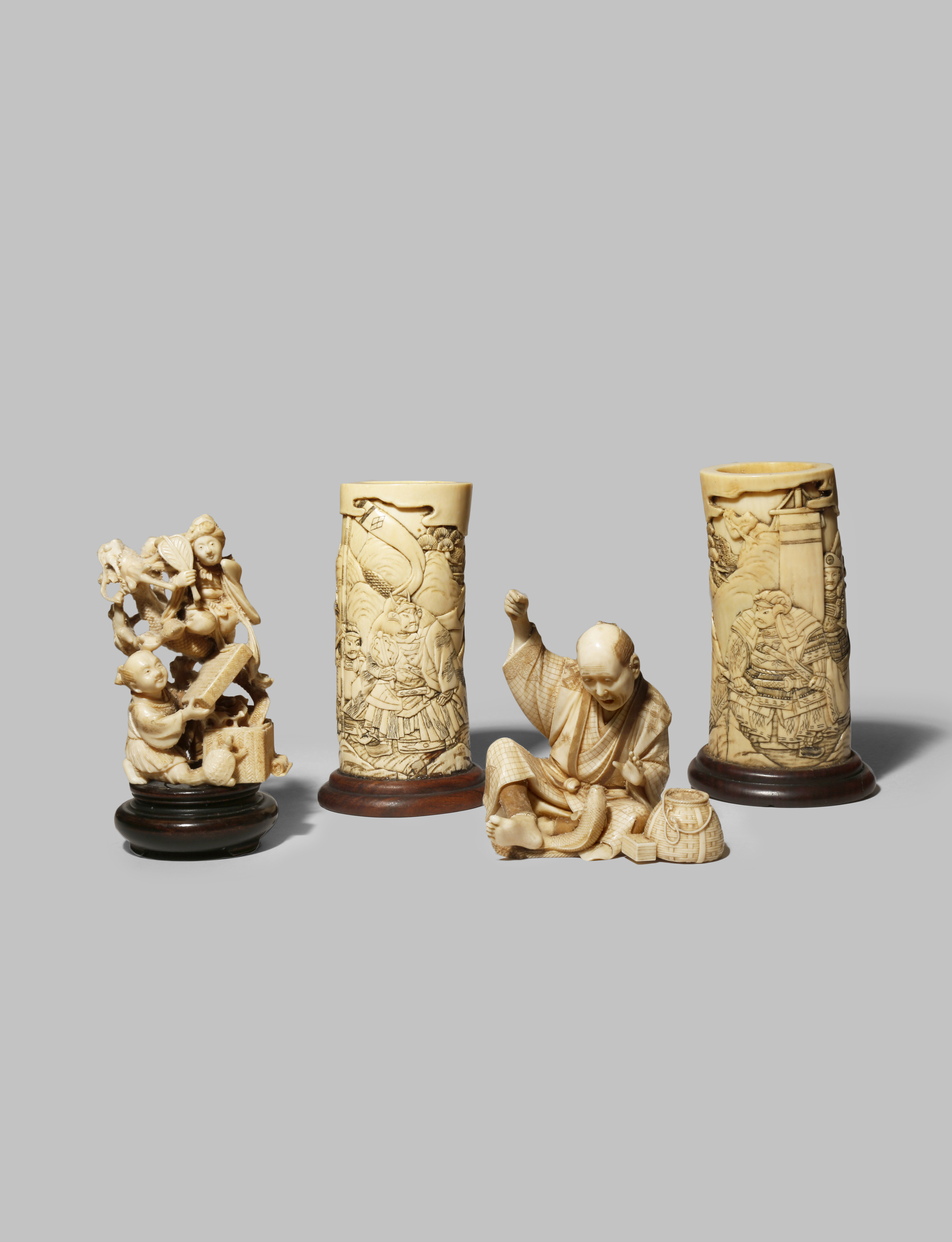 FOUR JAPANESE IVORY CARVINGS MEIJI 1868-1912 Comprising a pair of brushpots decorated with...