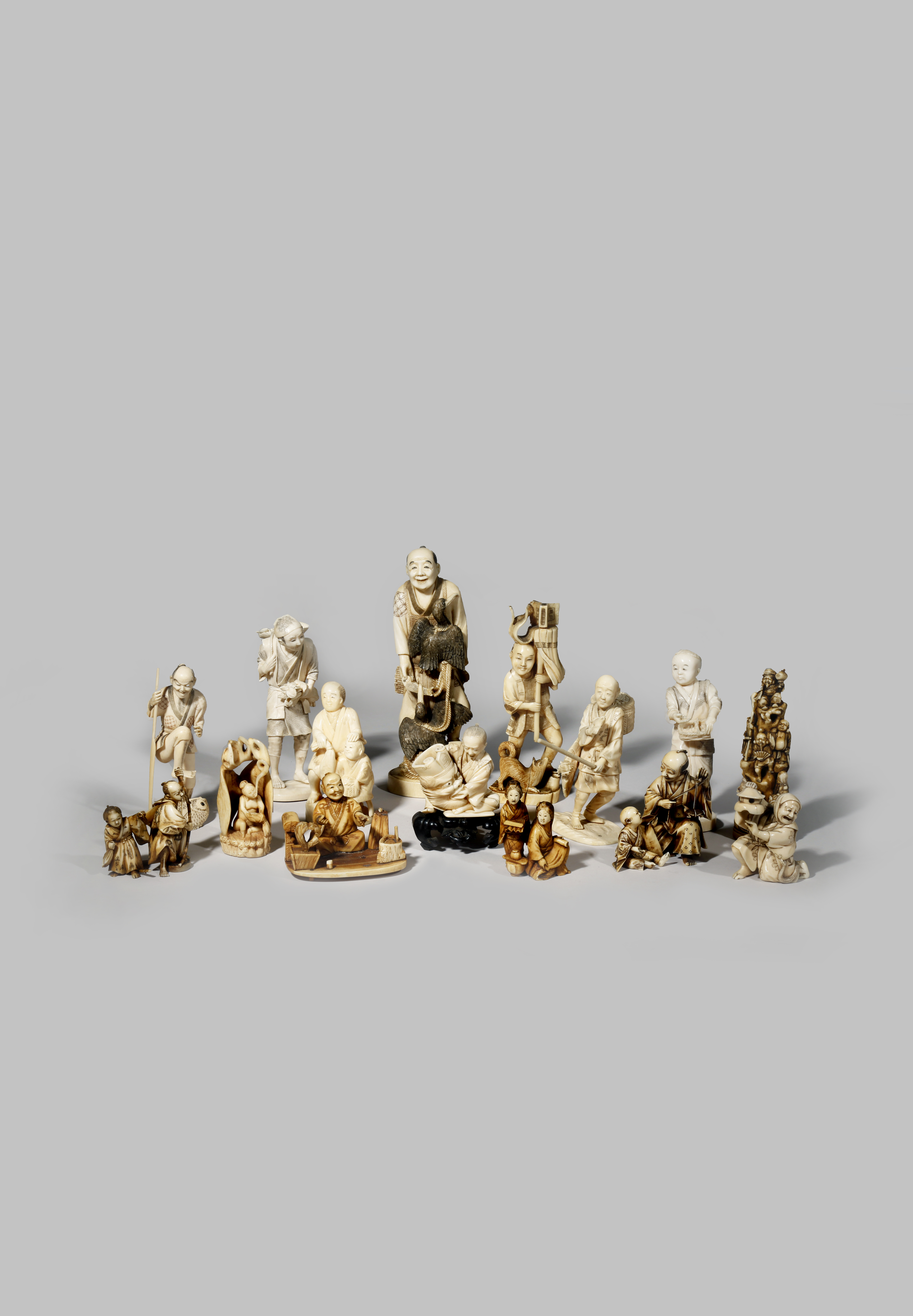FOURTEEN JAPANESE IVORY OKIMONO MEIJI 1868-1912 Variously carved as figures engaged in daily life