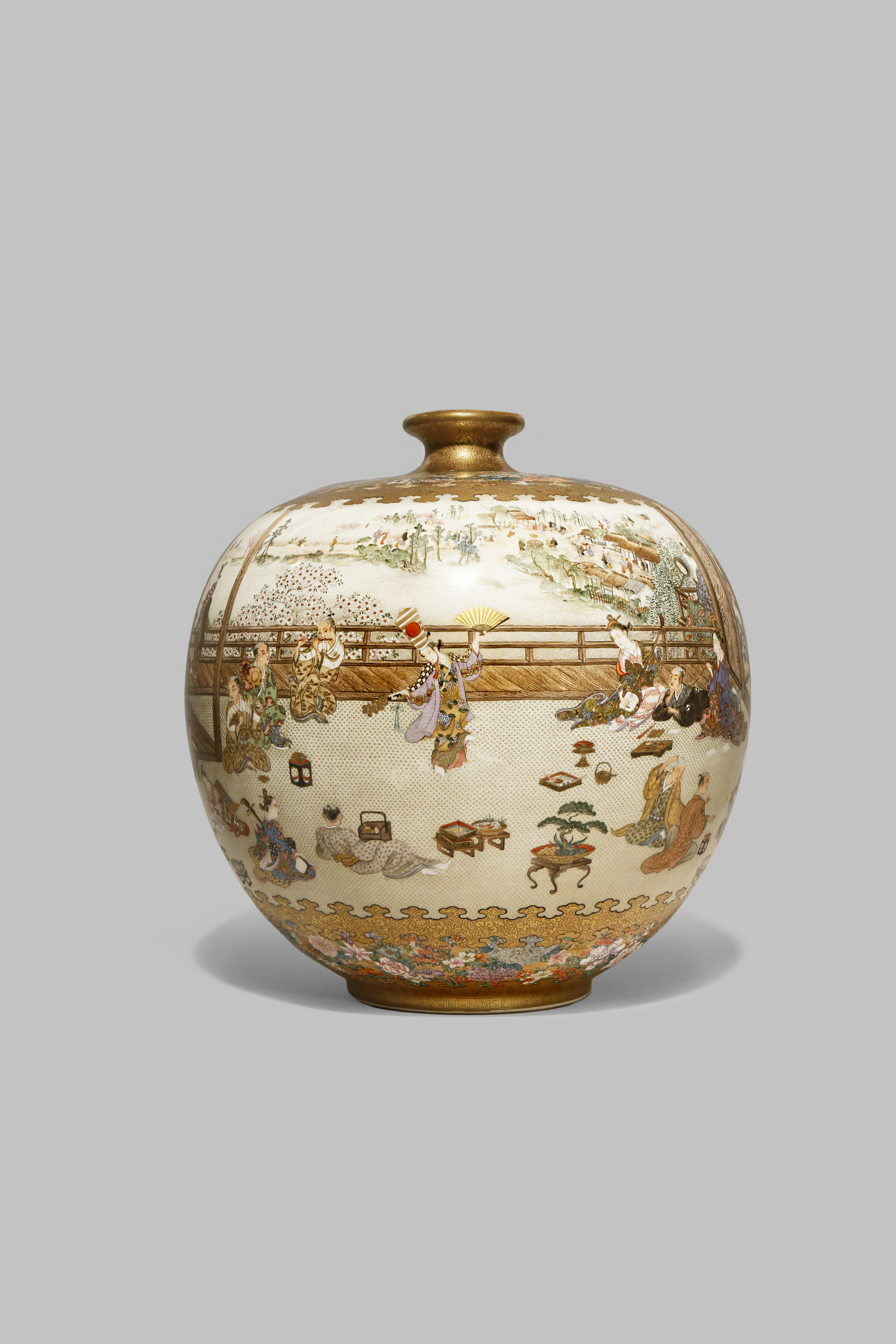 The spherical body finely decorated with a dense continuous design of many figures at a tea house, one side with musicians, a dancer and courtesans entertaining guests on a large balcony, a village visible in the distance, the other side with further courtesans and customers, with stairs leading to another room below where more figures stand, some visible through openings in a shoji paper wall, the shoulder and lower portion of the body with a band of millefleurs design, the foot with key fret and the neck with further stylised flowers in gilt, the base inscribed Kinkozan zo and Shozan/Masayama in shaped reserves surrounded by wisteria flowers and leaves, with another impressed mark for Kinkozan zo, 29cm high.