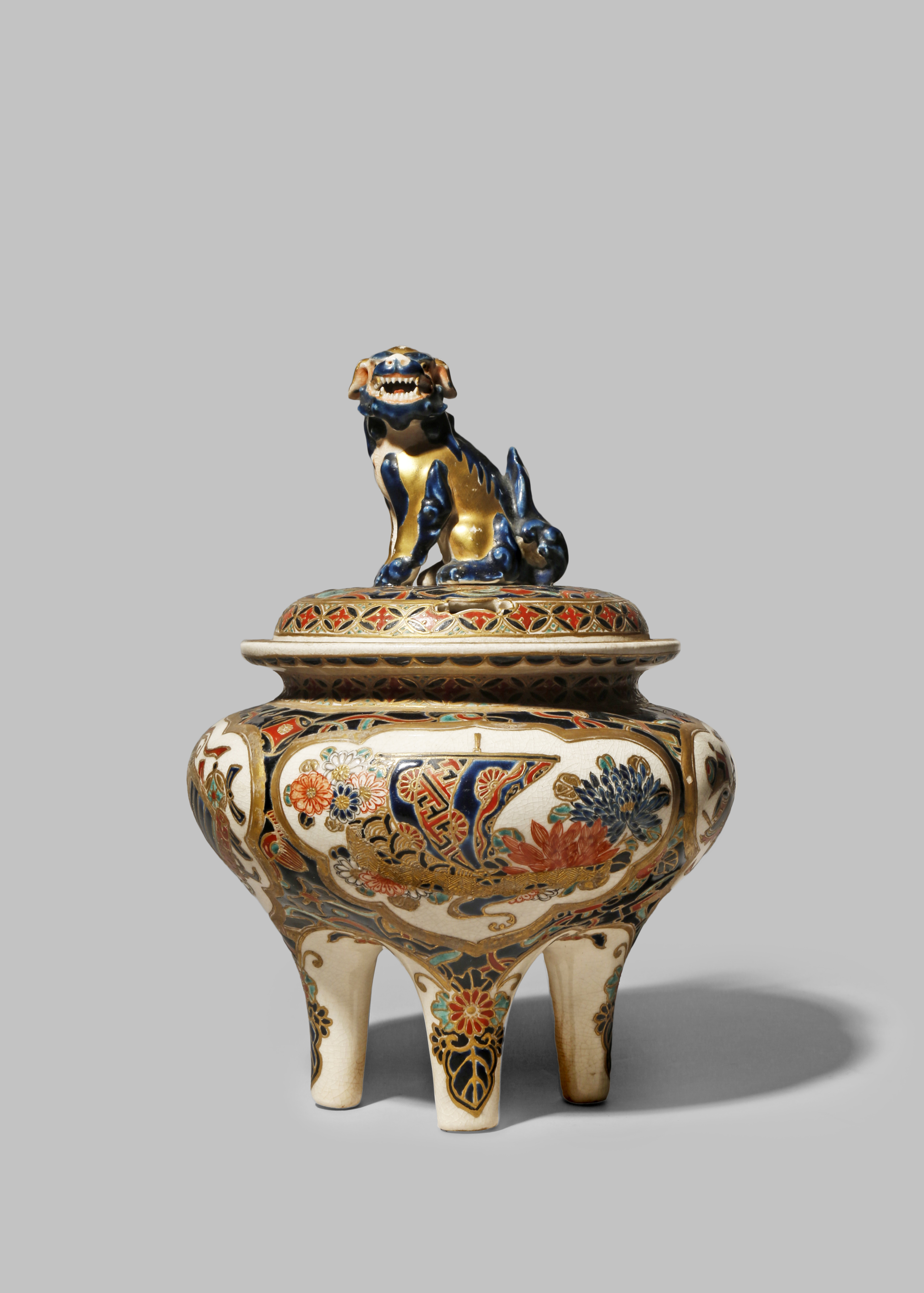 The short body raised on four slender legs, decorated in thick enamels with shaped panels containing flowers and sacred objects, the lid with similar decoration and topped with a ferocious-looking shishi, the base inscribed Dai Nihon Satsuma yaki Meizan with kao, a paper label for Empire Bazar underneath the lid, 21cm overall. (2)