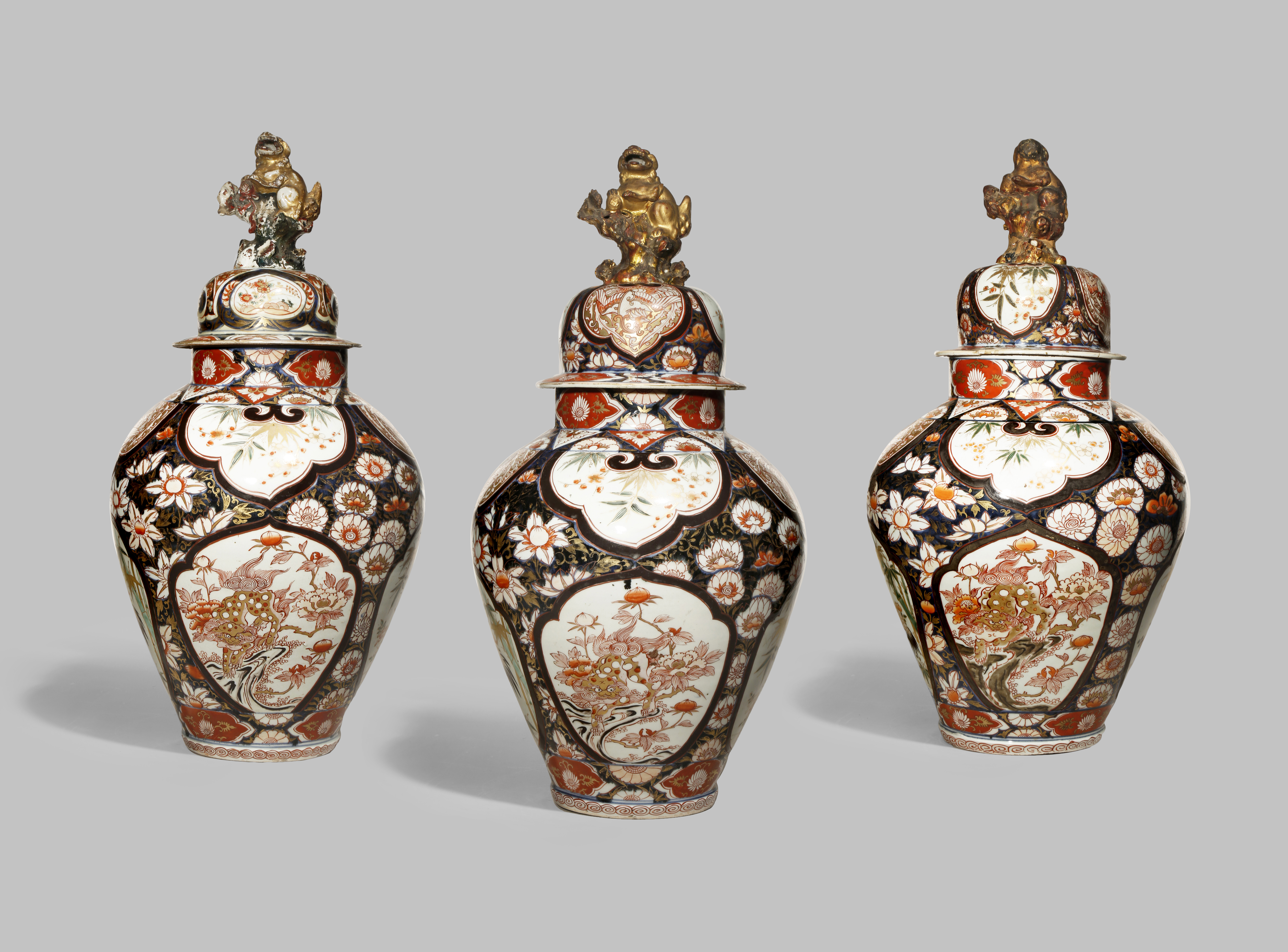 THREE JAPANESE ARITA IMARI VASES AND COVERS FROM A GARNITURE C.1700 The baluster bodies decorated...