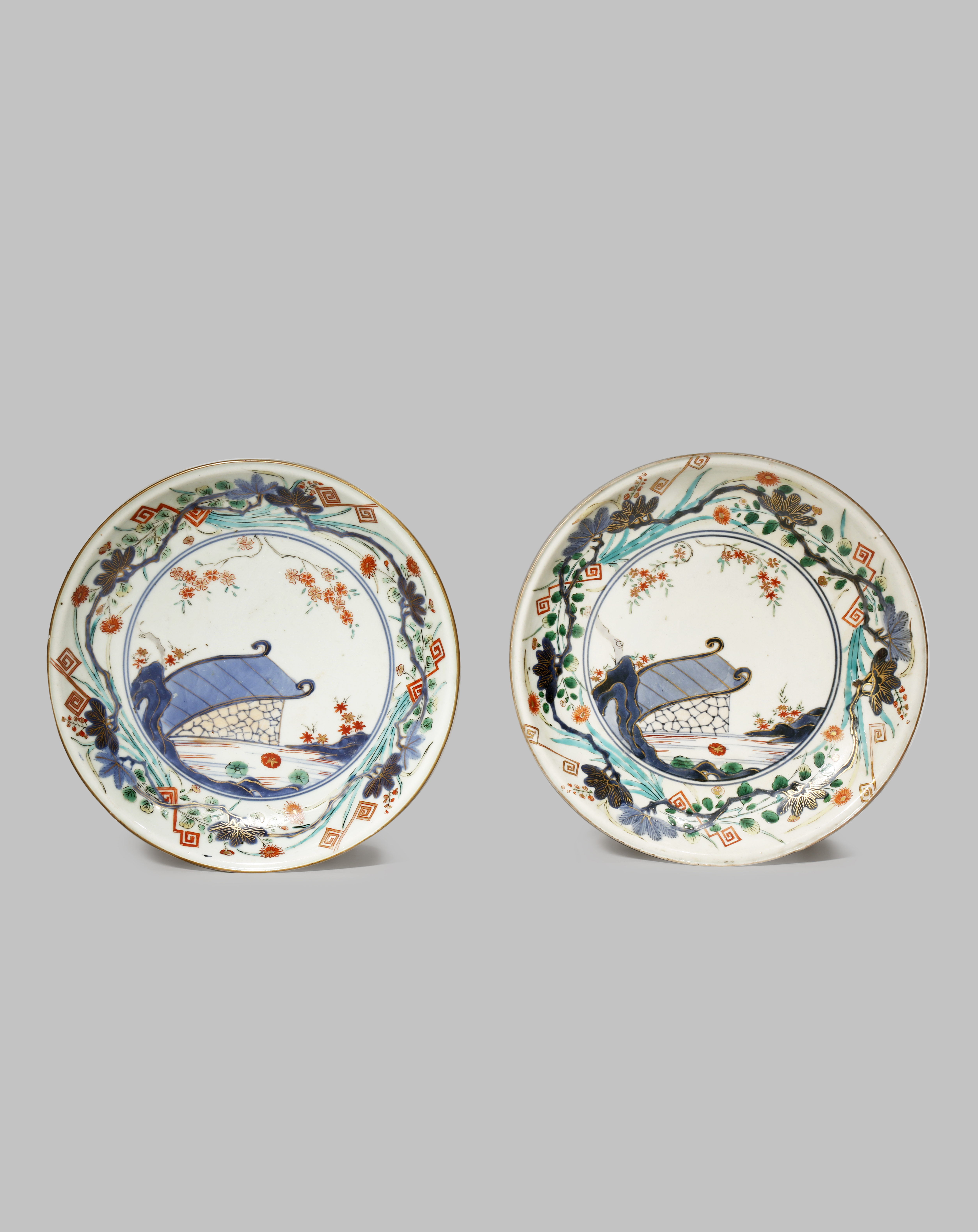 Both decorated with a central panel enclosing a stylised building by the water's edge, with rockwork beside it and flowering prunus above, the cavetto with a continuous band of pine, flowers, foliage and geometrical designs, the underside with flowers and scrolling tendrils, 22.4cm. (2)