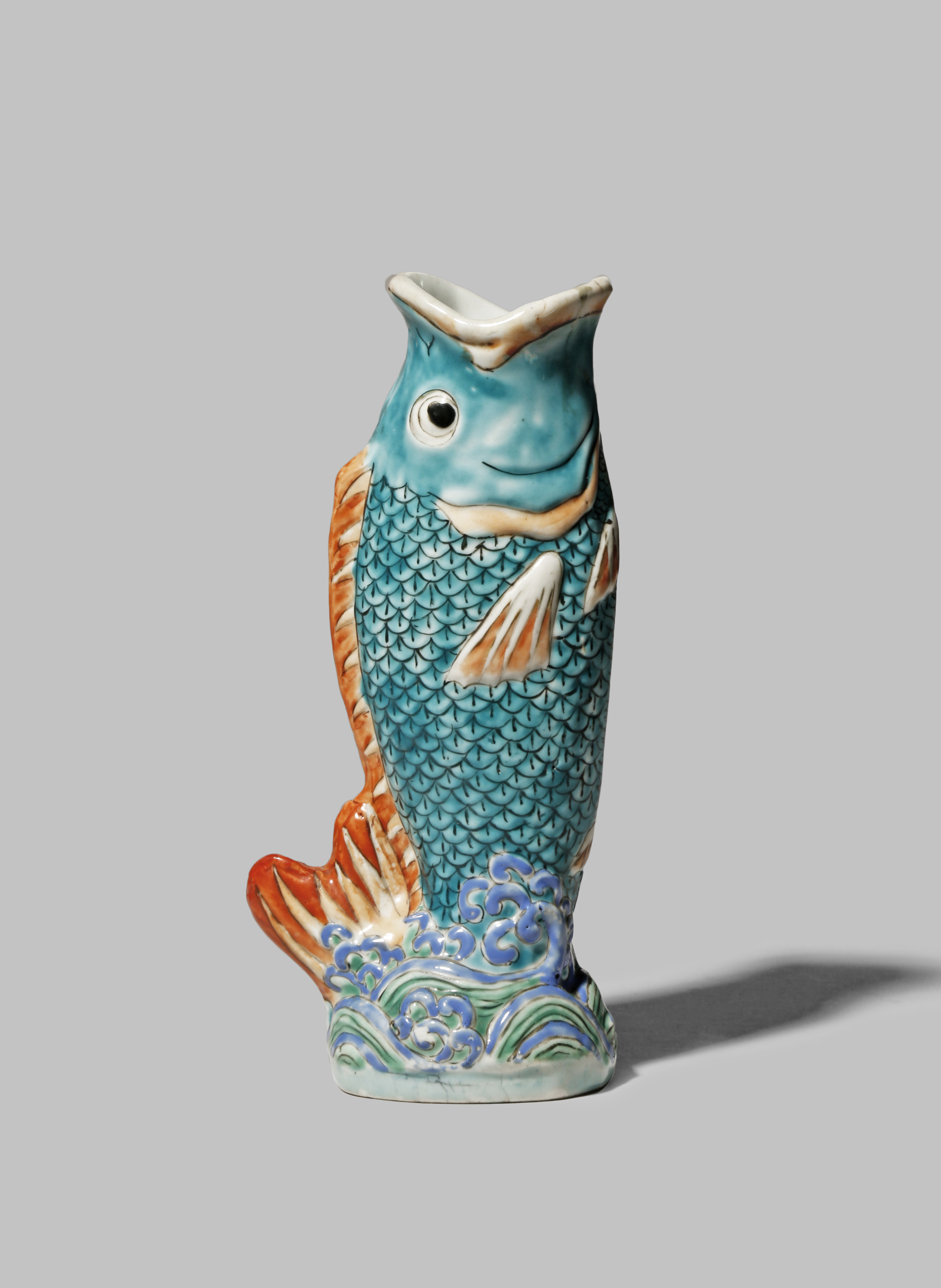 The fish depicted with its mouth wide open, its tail emerging from swirling water, painted in orange, cyan, turquoise and green enamels, 16.3cm.
