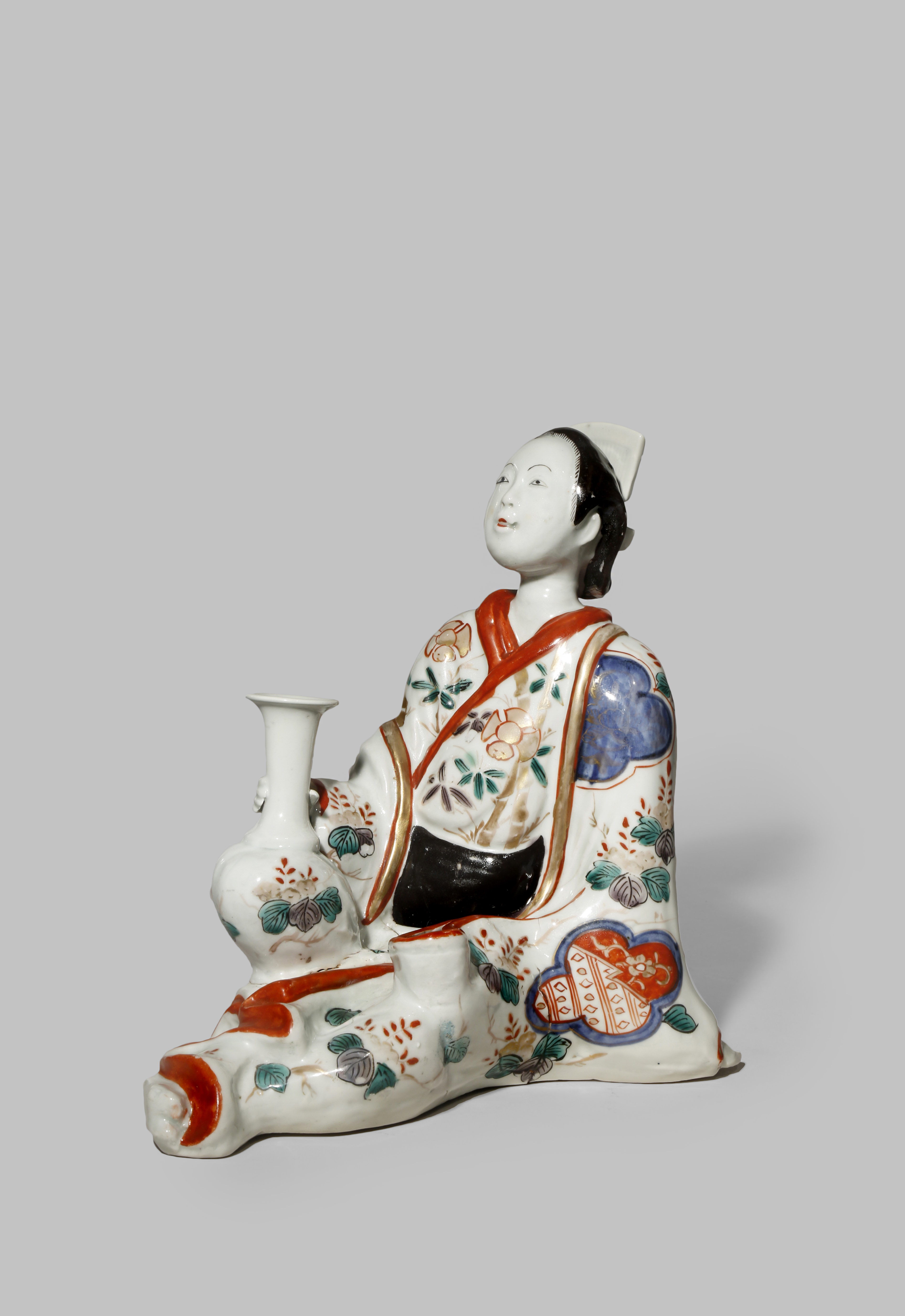 See B Davies, Barry Davies Oriental Art, Ko-Imari Porcelain from the Collection of Oliver Impey, p.202 fig.120 for a similar figure holding a candlestick. Also, Christie's, London, 16 May 2012, lot 232 for a pair of comparable bijin described as inkwells.