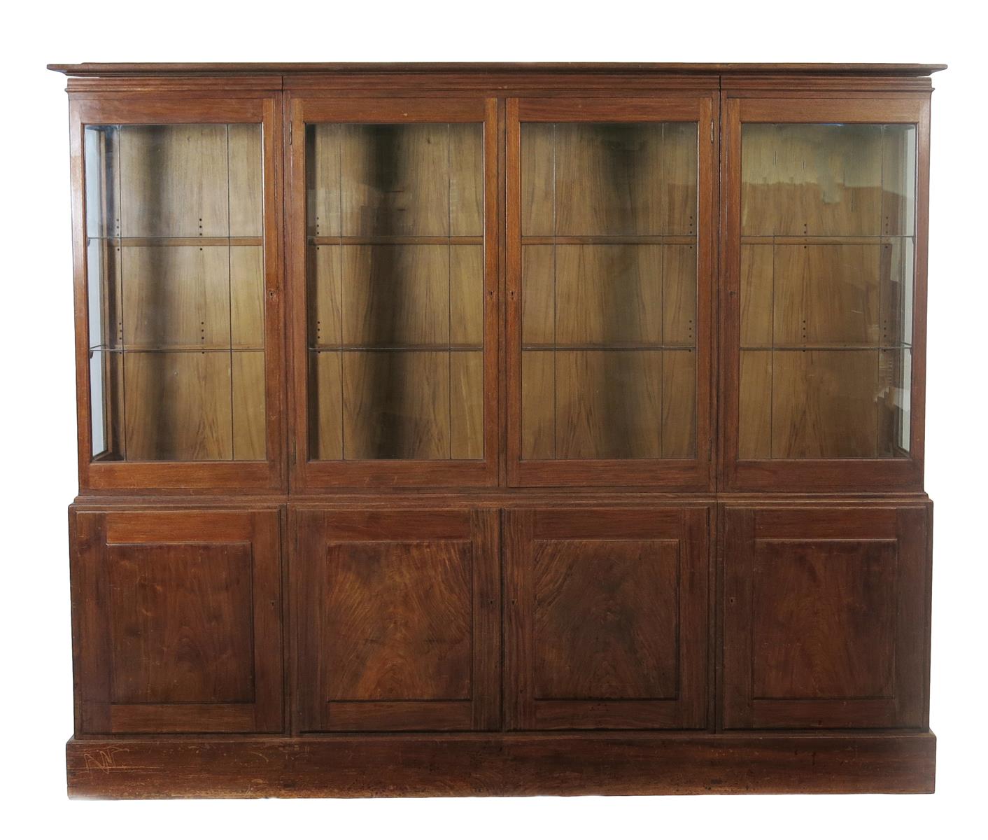 A large Barnsley Workshops glazed walnut bookcase designed by Edward Barnsley, double panelled door compartment, flanked by single cupboards, below leaded glass cabinets, glass shelves, stamped Barnsley, 249cm. wide, 209cm. high, 43cm. deep.