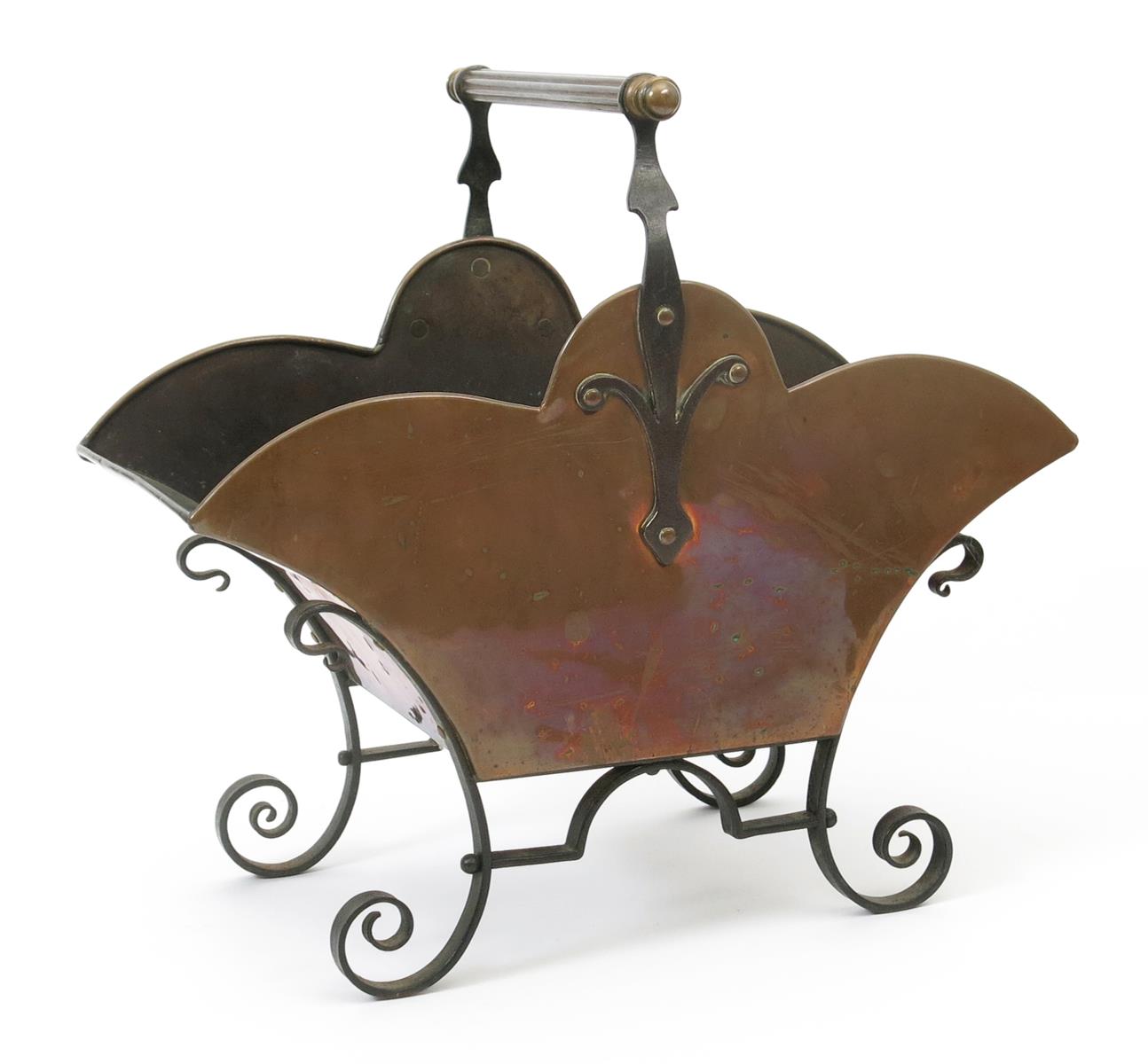 A Benham & Froud copper and wrought iron coal scuttle probably designed by Dr Christopher Dresser, flaring rectangular form on scroll feet and central bar carry handle, stamped mark to base, 50cm. wide.