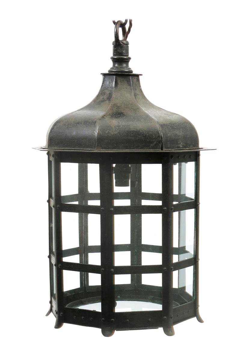 A large Cotswold School patinated iron hall lantern, octagonal section with tapering dome top, with clear glass panels, unsigned, 42cm. high