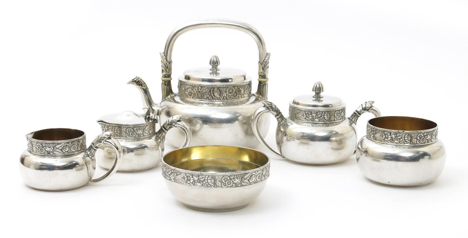 ‡ A Gorham & Co electroplated metal and ivory tea set, cast with foliate bands, comprising teapot and cover with ivory insulators, milk-jug and hinged cover, sugar basin and cover, and an additional jug, sugar and slop basin, stamped marks, 20cm. high, (6)