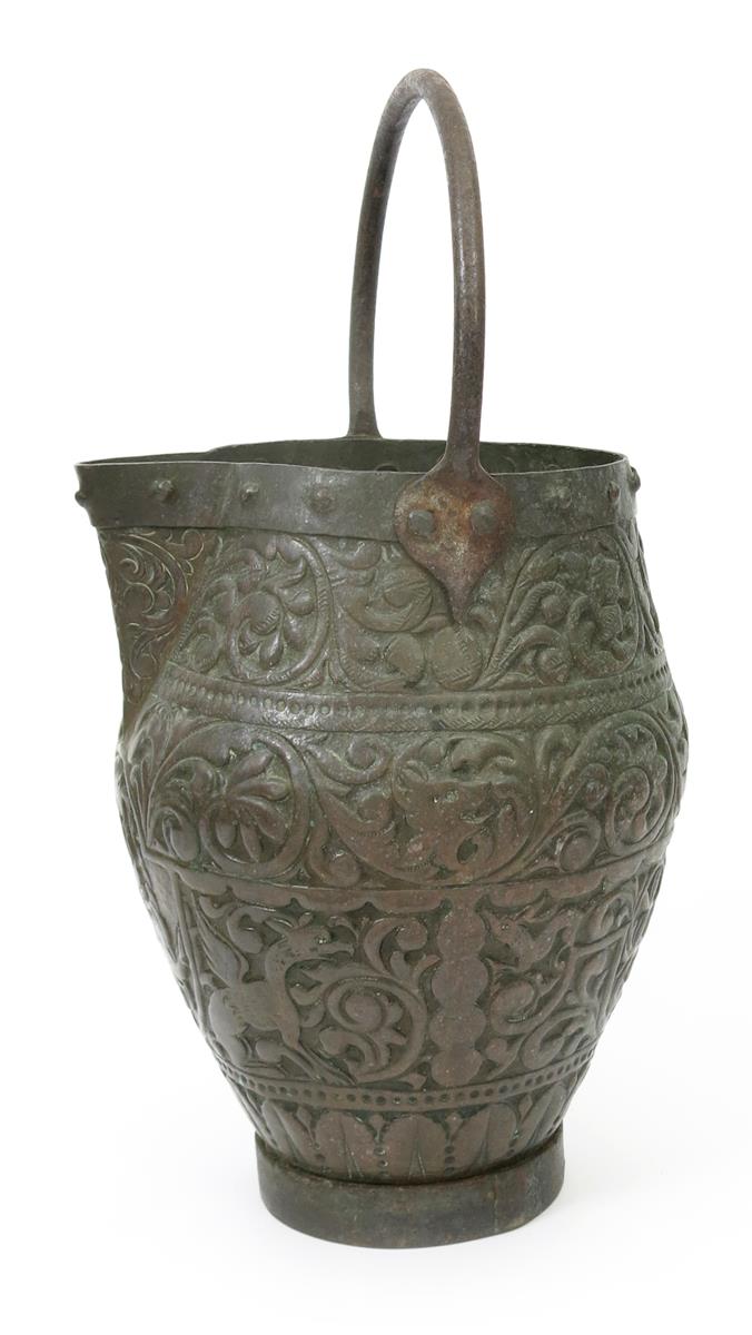 A large copper jug probably Home Arts and Industry, bellied form hammered with bands of mythical beast and scrolling foliage, with heraldic lion, riveted iron handle, unsigned, 43cm. high
