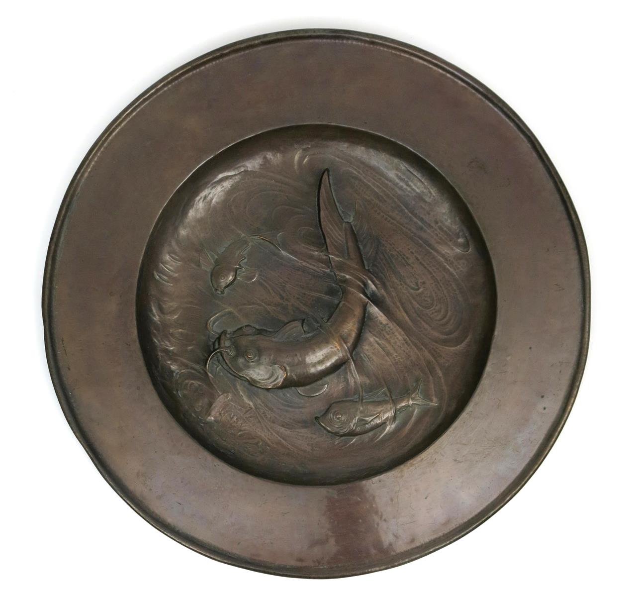 A patinated copper wall charger, stamped to the well with three fish swimming in turbulent water, unsigned, 58cm. diam.