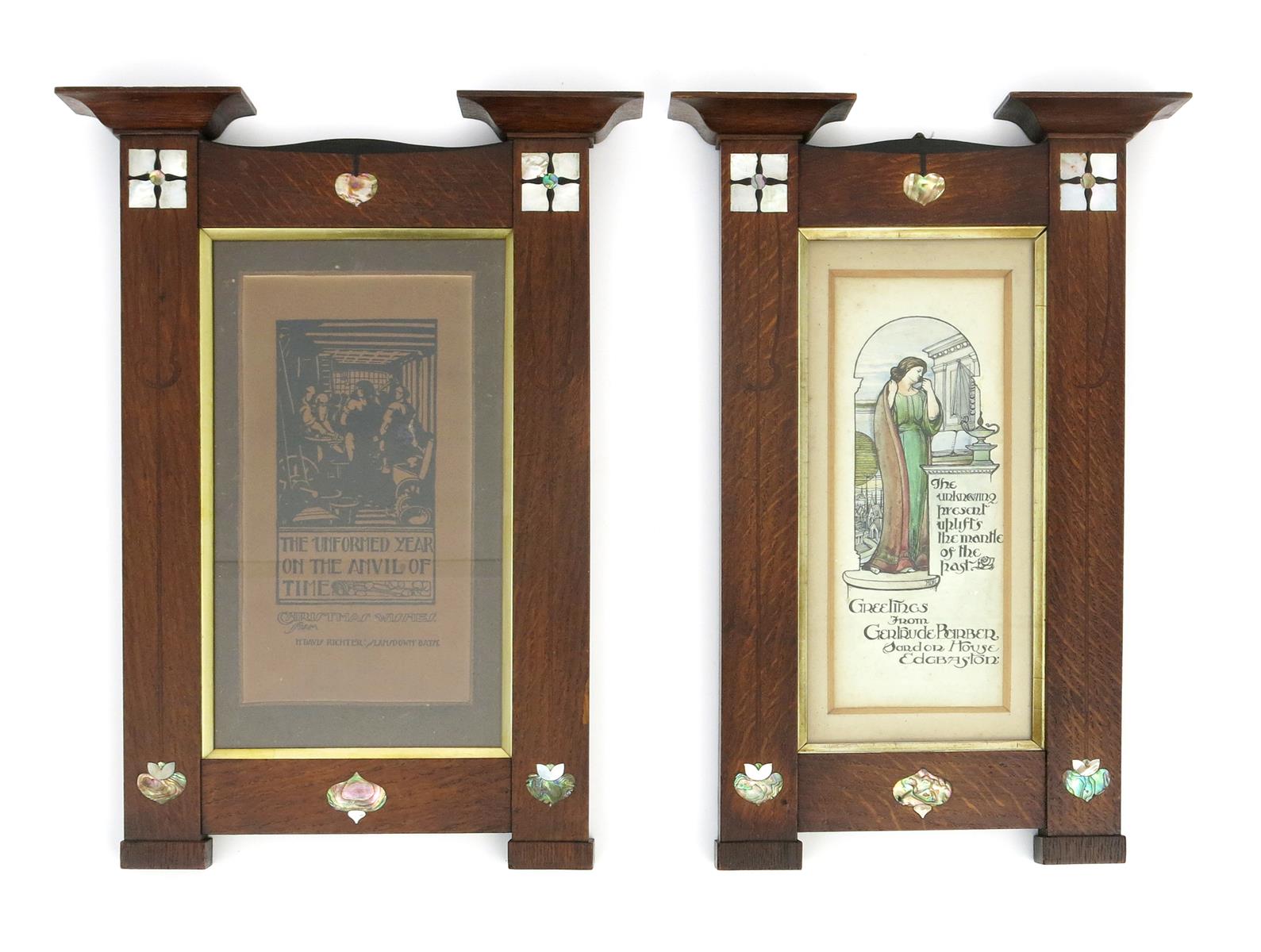 A pair of Bath Cabinet Makers oak picture frames, rectangular with flaring capitals and base, inlaid with fruitwood, ebony and mother of pearl stylised flowers, one framing a watercolour, pen and ink greeting by H D Richter, the other with a printed Christmas wishes from H D Richter, 40 x 26cm. (2)