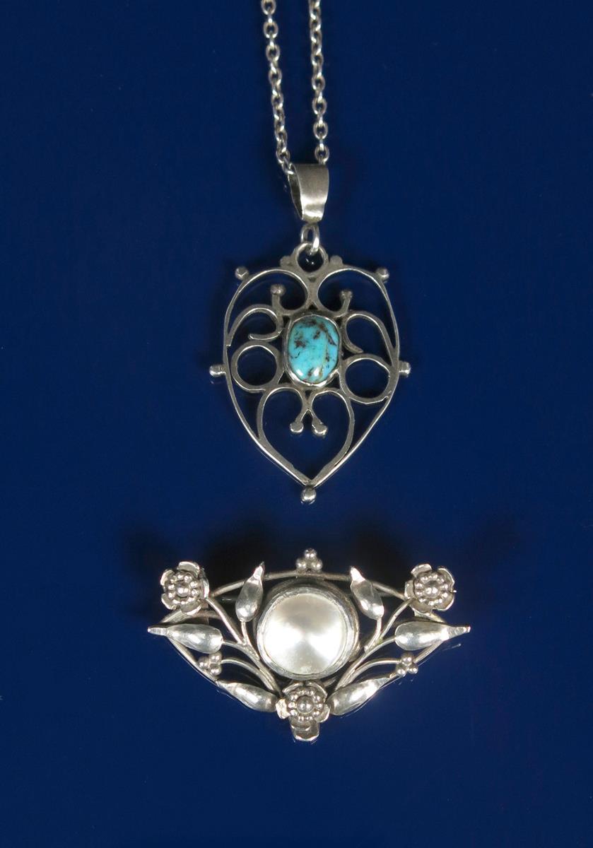 A silver pendant necklace, the heart-shaped wirework body with scrolls and set with a central turquoise, and a silver brooch cast with flower stems and set with central mother of pearl panel, unmarked, 3.5cm. long (2).