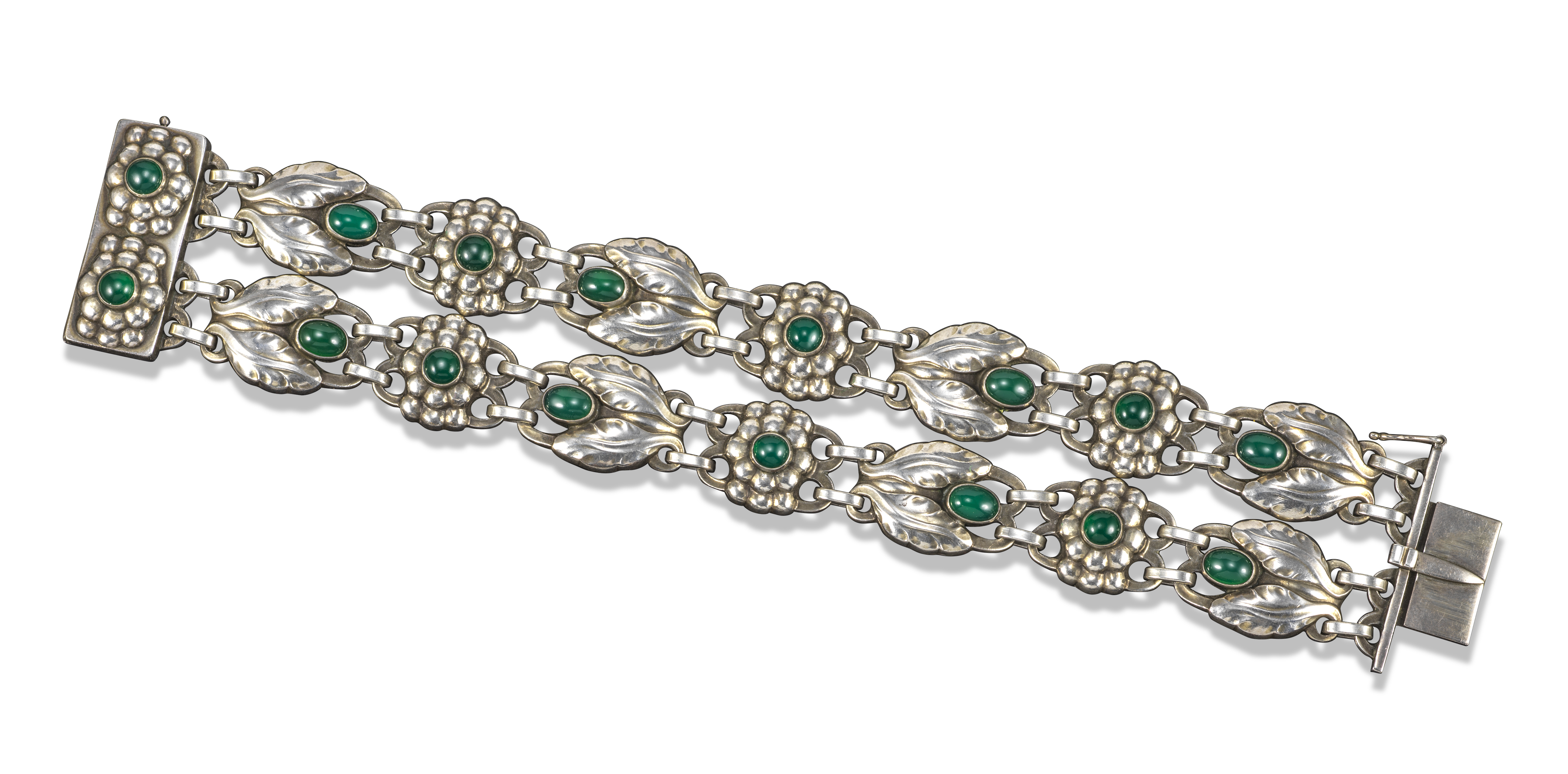 A silver and green agate foliate bracelet, design no. 3, post-1945, formed as two rows of foliate links, each set with a green agate cabochon, with conforming oblong box clasp, stamped Sterling Denmark and with maker's mark, 18.5cm long