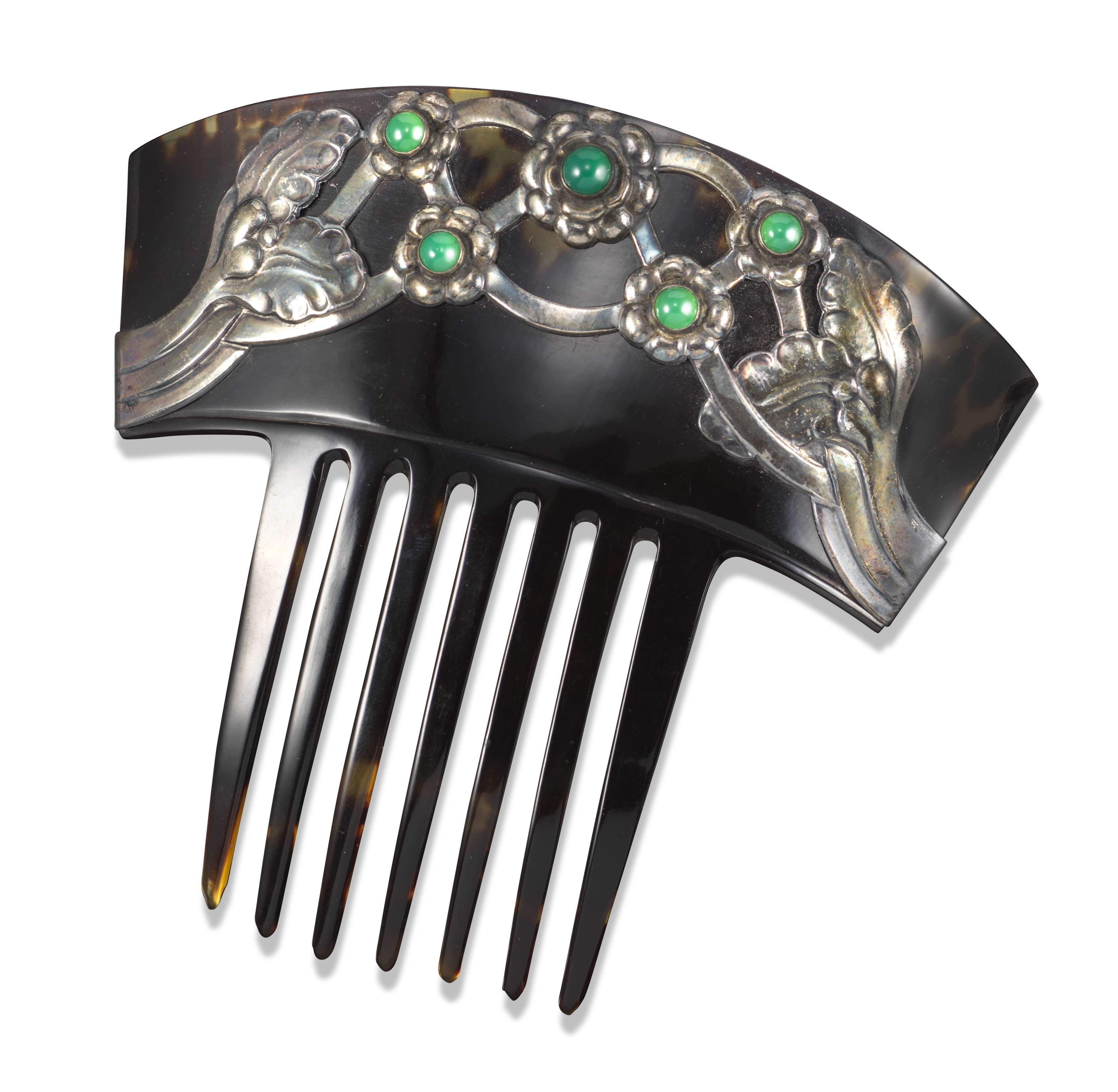 A tortoiseshell haircomb by Georg Jensen, design no. 1, post-1945, with silver foliate and strapwork decoration, set with five green agate cabochons, with small silver disc to reverse stamped Sterling Denmark and with maker's mark, 11cm high, 12cm wide