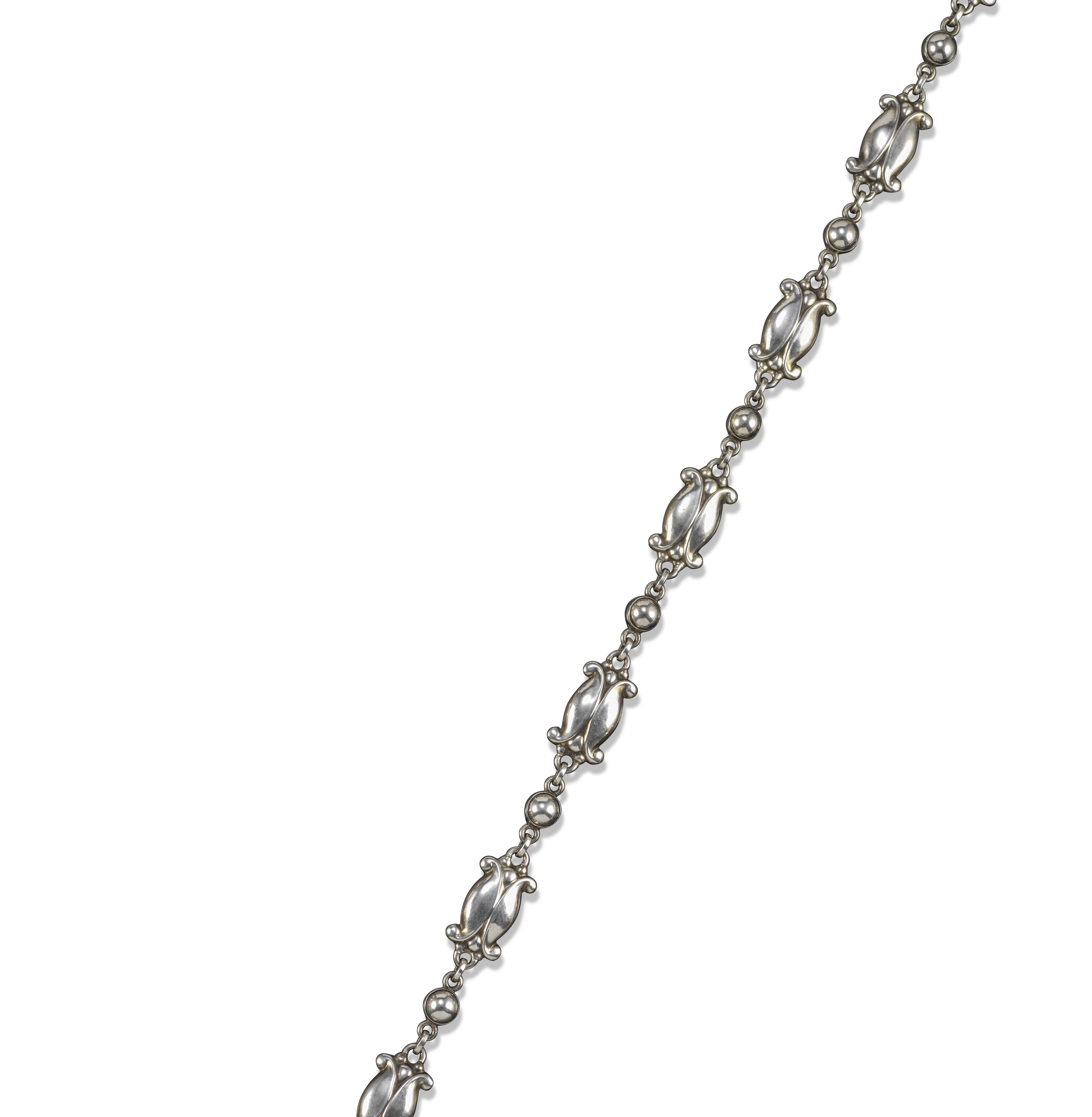 A silver 'Seed & Pod' necklace by Georg Jensen, design no. 11, post-1945, each scrolling foliate link alternately-set between domed silver bosses, with box clasp with safety catch, stamped Sterling Denmark, with maker's mark, 41cm long