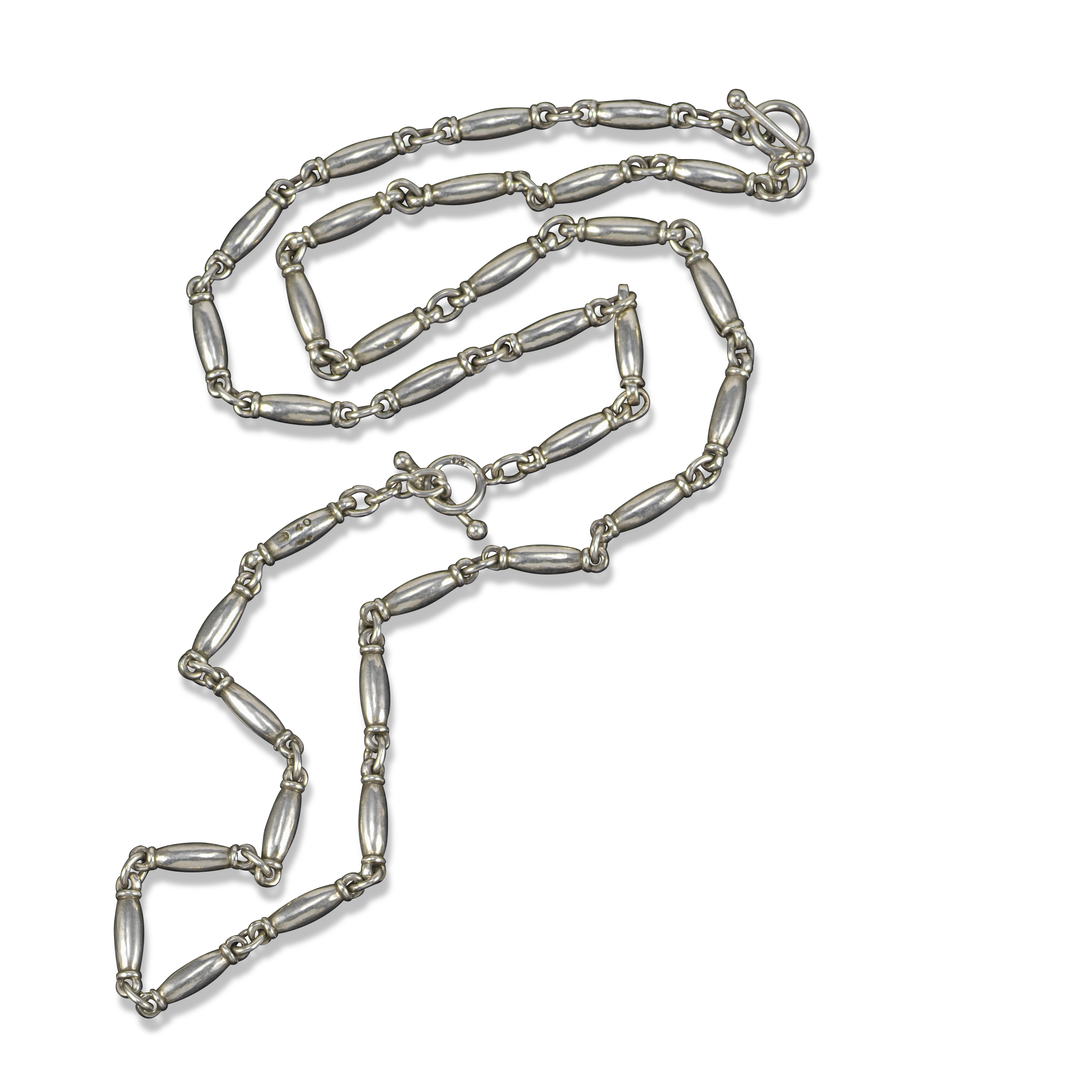 A silver necklace and bracelet suite by Georg Jensen, designs no. 40 & 43 by Henry Pilstrup, c1984, designed as a line of barrel-form links with oval-link connections, toggle clasps, both stamped 925 Denmark and GJLtd, London import marks for 1984 and with maker's mark, necklace 42cm long, bracelet 19.3cm long
