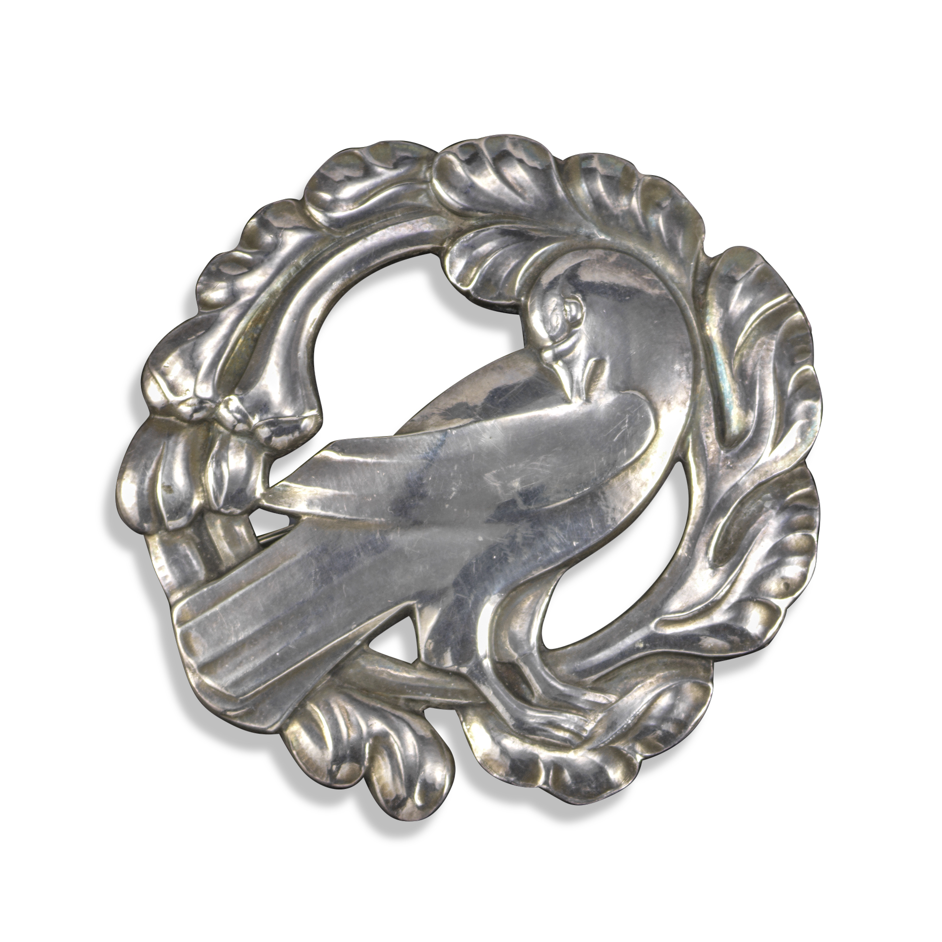 A circular silver bird brooch by Georg Jensen, design no. 70, undated, post-1930, of openwork design and depicting a dove amongst a foliate circular frame, the dove motif designed by Christian Mohl-Hansen, stamped 925 Sterling Denmark and initialed GI, 6cm wide