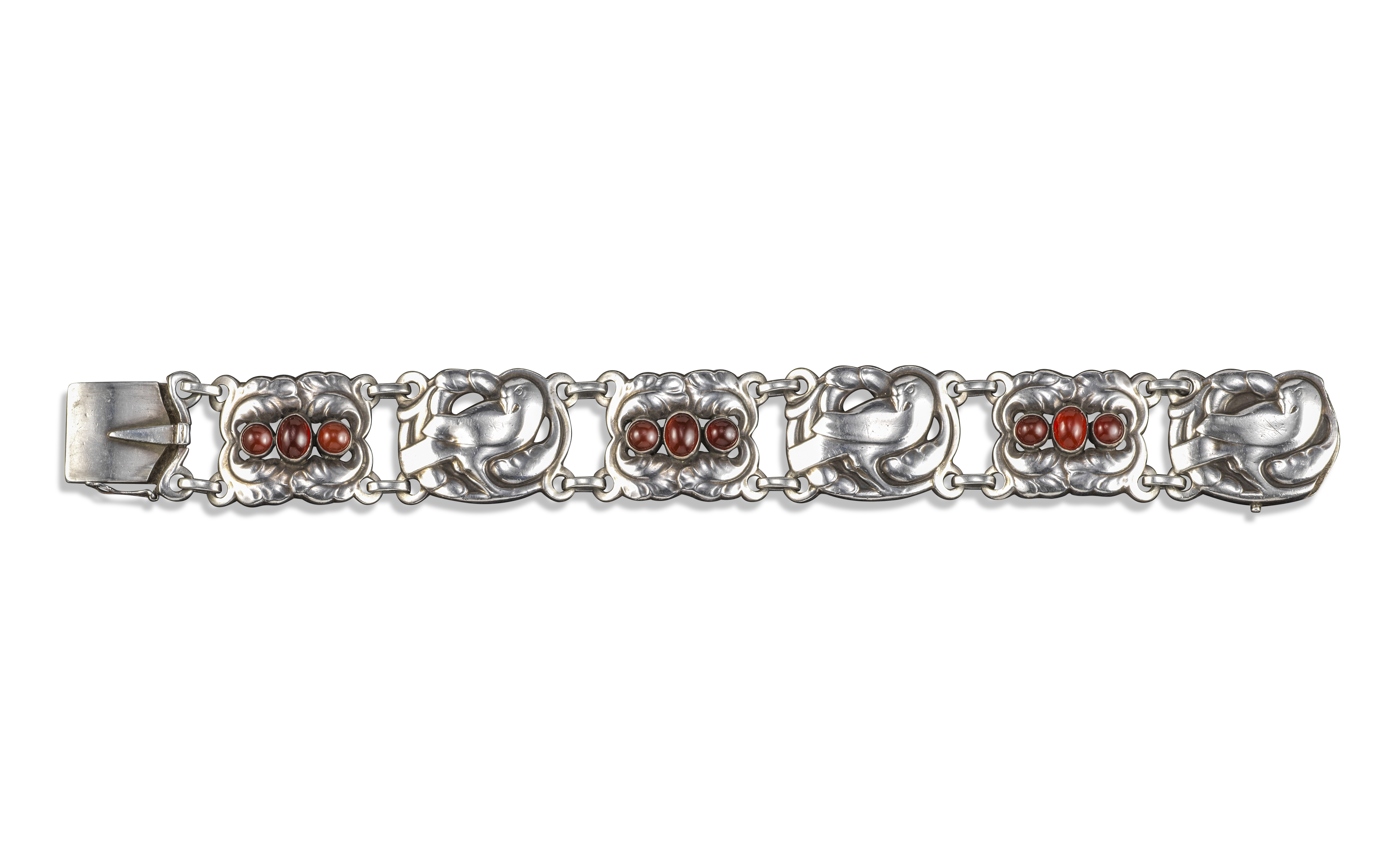 A silver and carnelian-set dove brooch by Georg Jensen, design no. 14, undated but post-1930, the dove motif designed by Christian Mohl-Hansen, the bracelet formed with alternating dove plaques and three-stone carnelian foliate plaque links, with box clasp and safety catch, stamped 925 Sterling Denmark, 18cm long