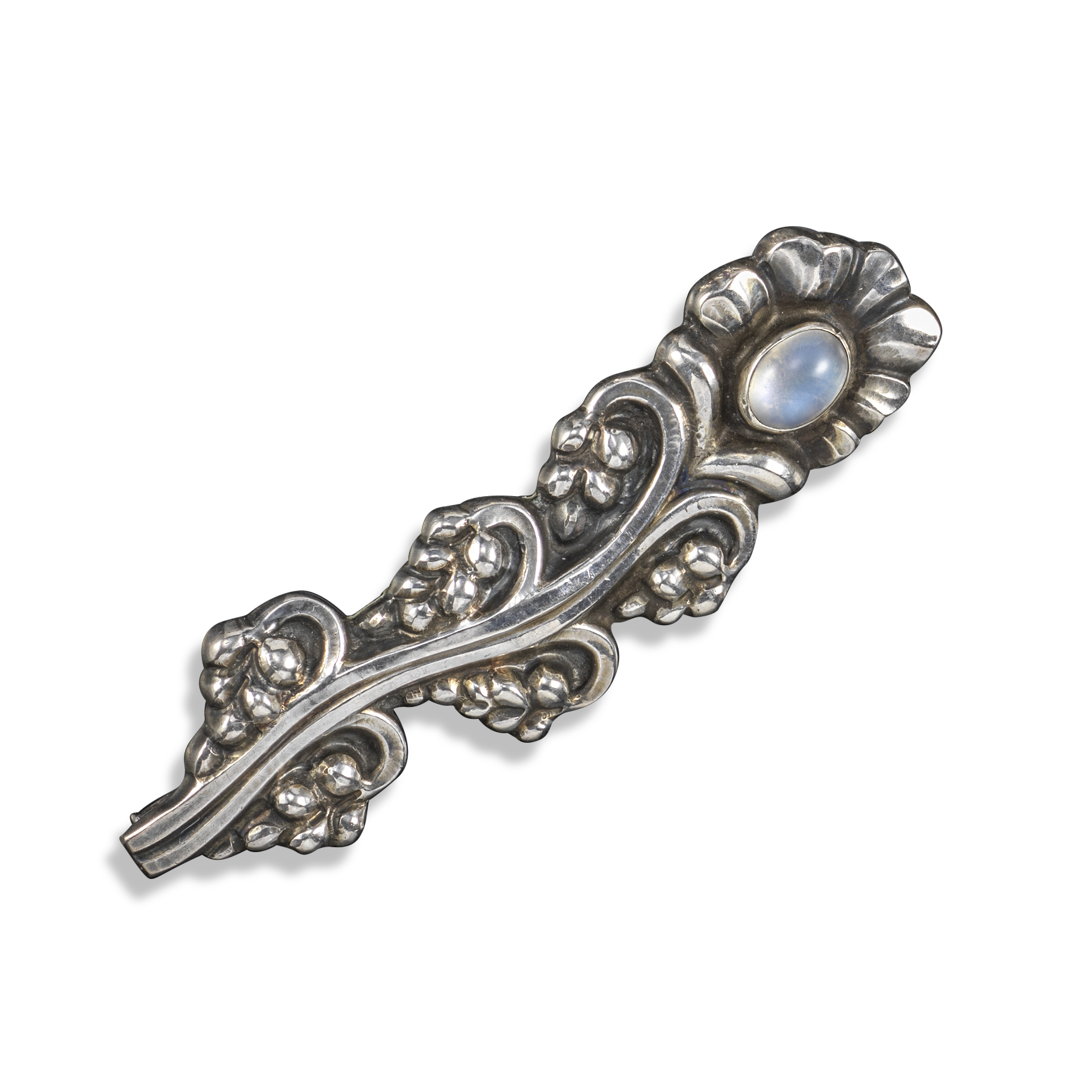 A silver and moonstone foliate brooch by Georg Jensen, design no. 104, c1933-1944, of floral spray-design and set with a moonstone cabochon, stamped 925 Sterling Denmark, with maker's mark, 6.7cm high