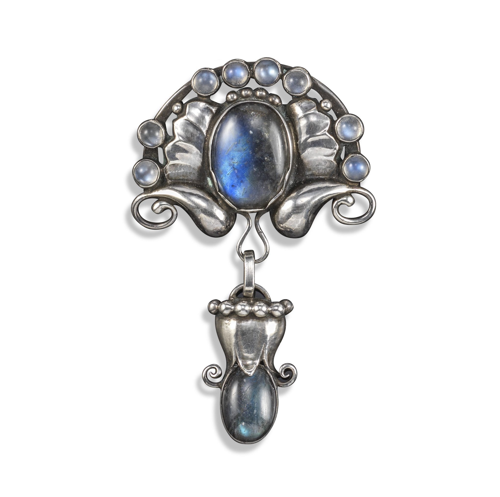 A silver, labradorite and moonstone foliate brooch by Georg Jensen, design no. 92, c1933-1944, the upper arc-form section set with a central oval labradorite cabochon and eight moonstones with bead and scroll decoration, suspending a further labradorite and beaded silver bud-form drop, stamped 925 Sterling Denmark, with maker's mark, 6.5cm high