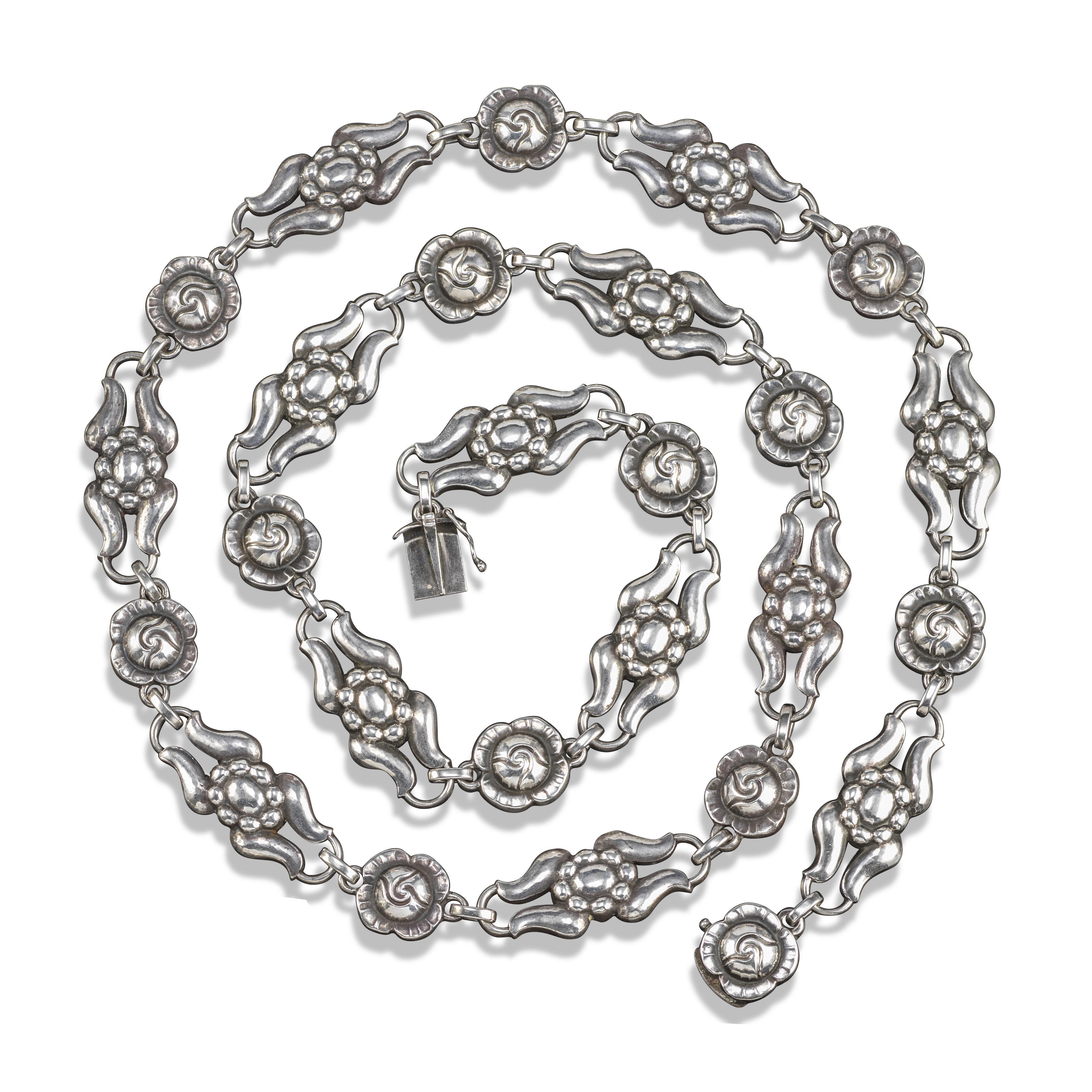 A silver foliate necklace by Georg Jensen, design no. 10, undated post-1930, each scrolling foliate link alternately-set between four petal flower head links, stamped 925 Sterling Denmark, engraved GJ, 69cm long