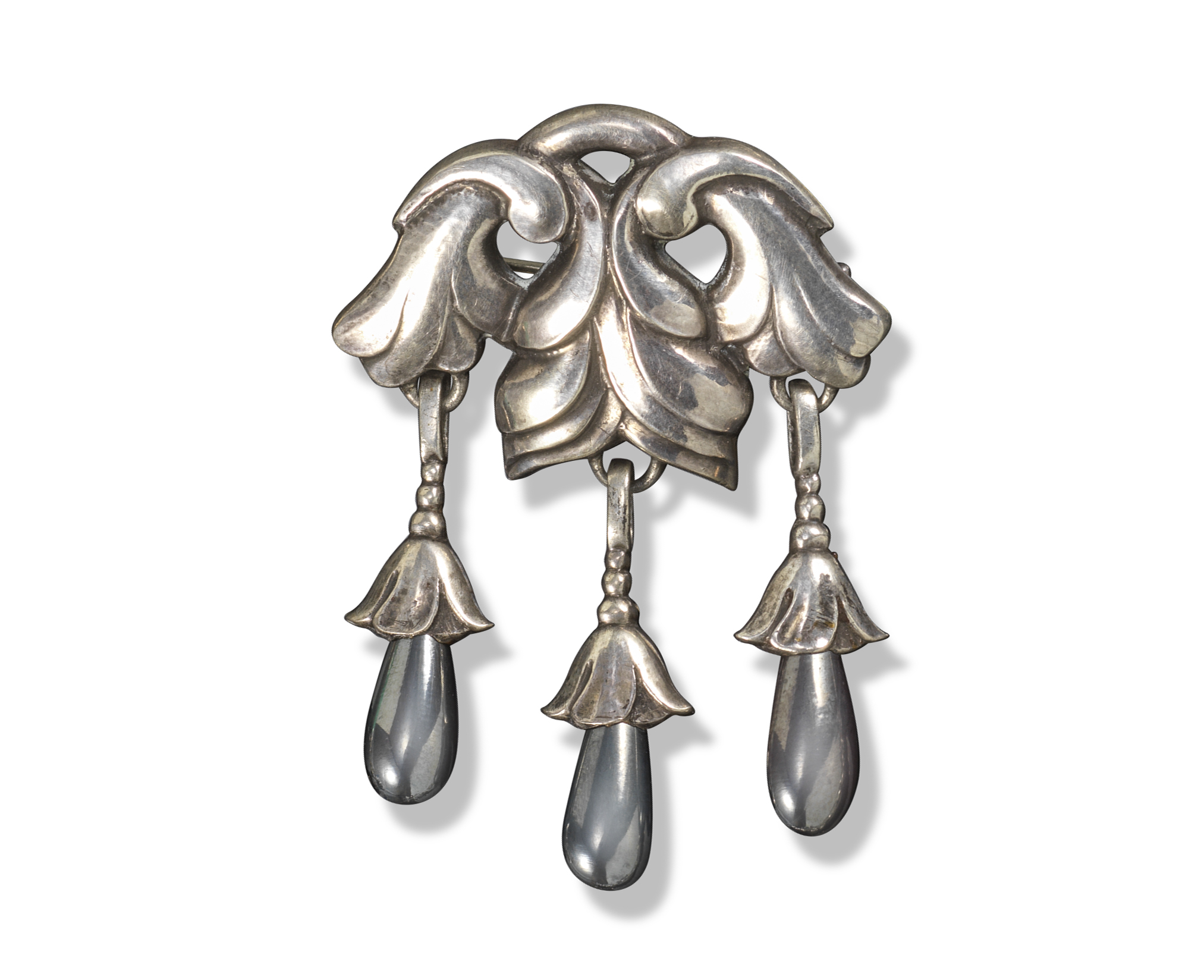 A silver and hematite brooch by Georg Jensen, design no. 132, c1915-1930, the silver foliate upper section suspending three polished hematite drops, stamped 830 and with maker's mark, 5.5cm high