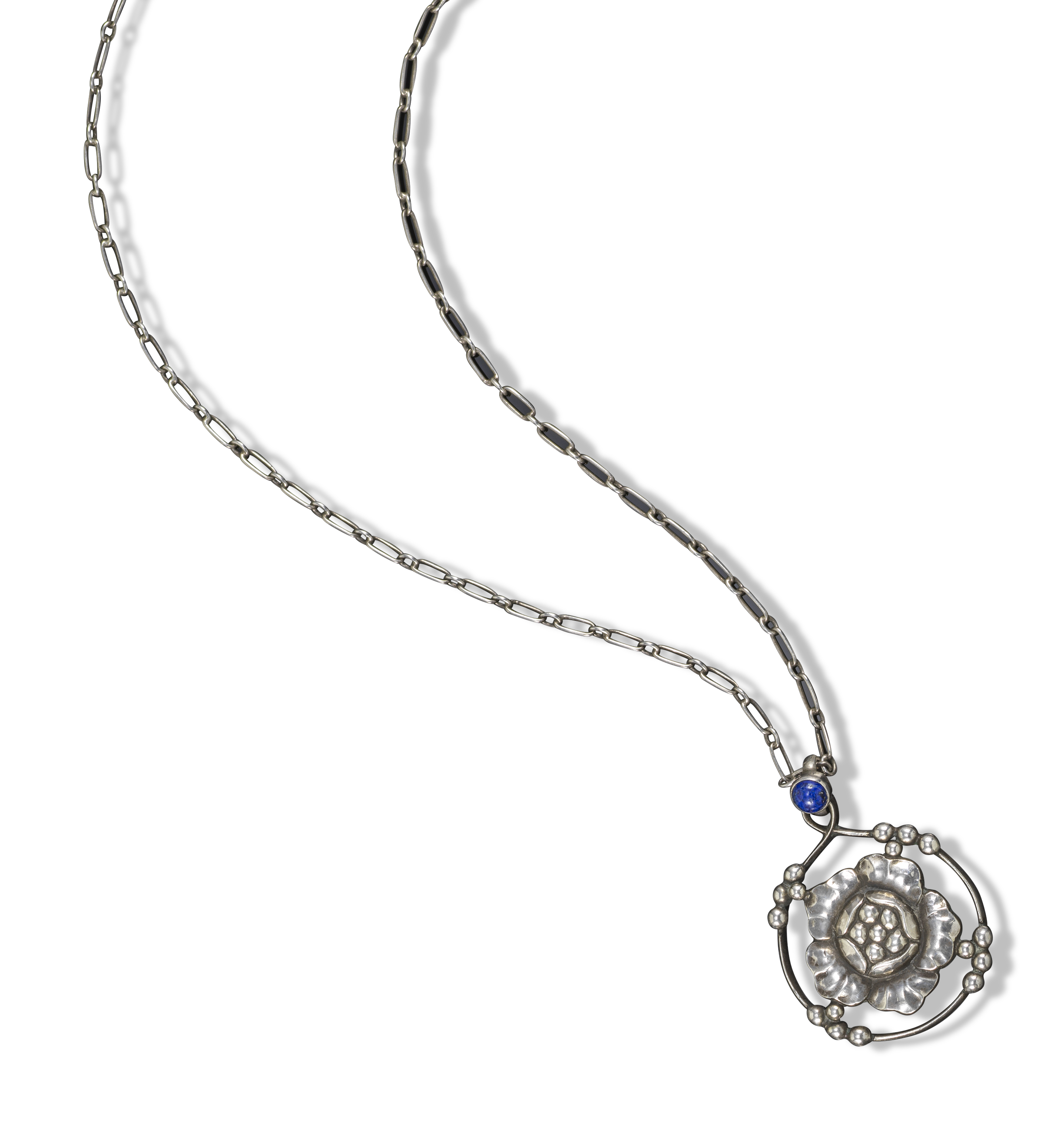 A silver and lapis lazuli flower head pendant by Georg Jensen, design no. 24, c1915-1930, the silver flower head within beaded frame, the suspension set with a lapis lazuli cabochon, on fetter link silver chain with toggle clasp, stamped 830 Copenhagen, with maker's mark, pendant 3cm high, chain 60cm long