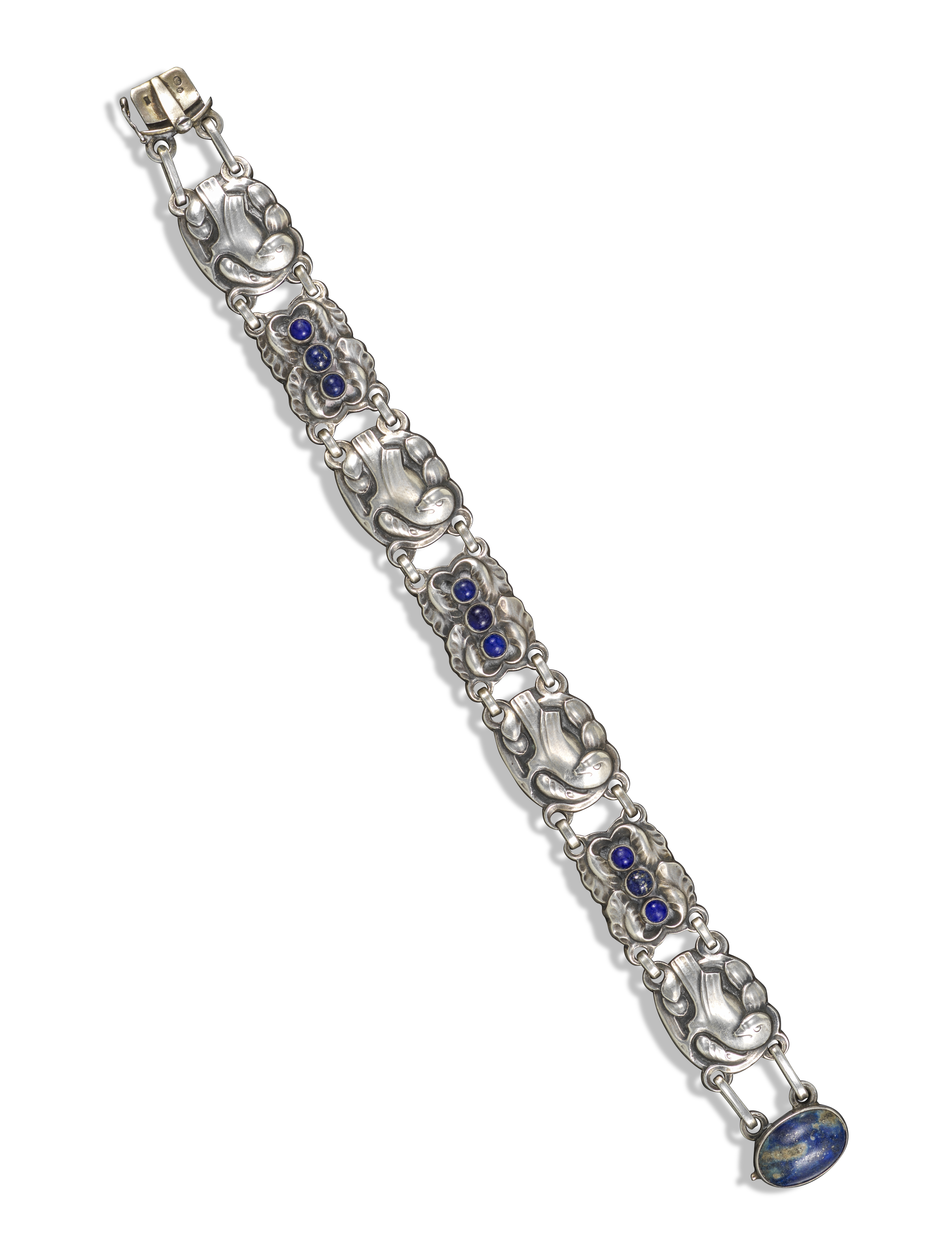 A silver and lapis lazuli bracelet by Georg Jensen, design no. 24, c1915-1927, the dove motif designed by Christian Mohl-Hansen, the bracelet formed with alternating dove plaques and three-stone lapis lazuli foliate plaque links, with box clasp set with a lapis lazuli cabochon and with safety catch, stamped 830, with Romanian import marks for 1969 and with maker's mark, 19cm long