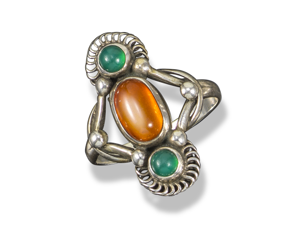 A gem-set silver ring by Georg Jensen, design no. 15, c1909-1915, vertically set with an amber and two green agate cabochons within wirework frame, with bead decoration to the bifurcated shoulders, stamped 830S and with maker's mark, size O