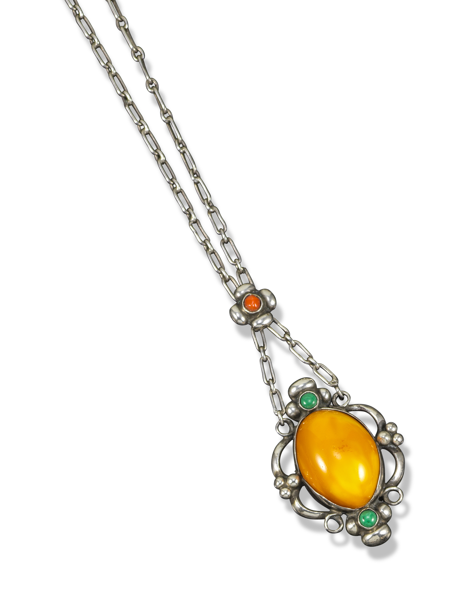 A silver, amber, malachite and coral pendant by Georg Jensen, design no. 21, c1915-1927, the silver foliate frame set with two malachite cabocons and a central amber cabochon, suspending from a coral-set flower head on silver fetter-link chain with toggle clasp, stamped GI, 830S Copenhagen, with maker's mark, lower pedant 3.3cm high, chain 42cm long