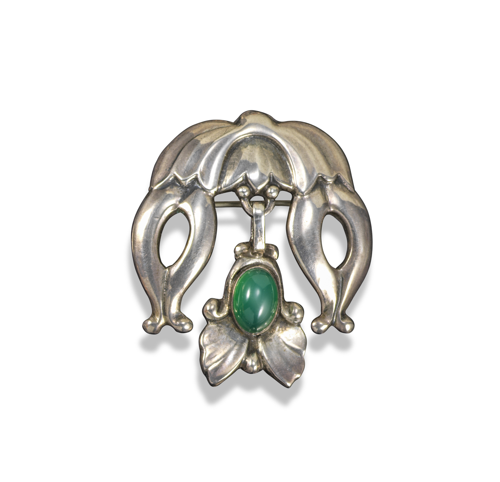 A silver and green agate brooch by Georg Jensen, design no. 17, c1909-1914, the silver foliate upper section suspending a further foliate drop setion set with a green agate cabochon, stamped 830S and with maker's mark, 4cm high