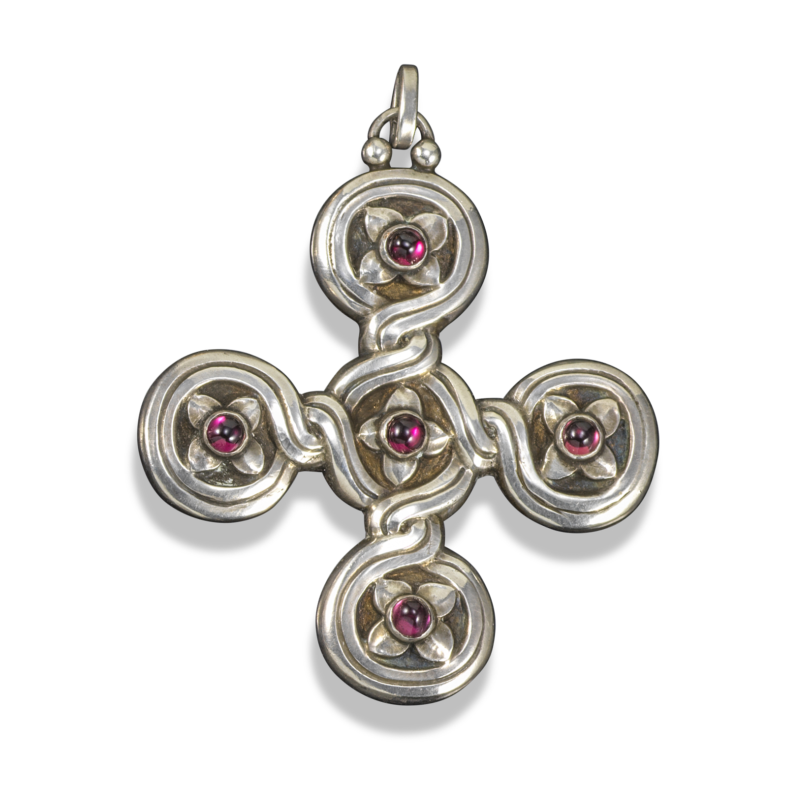 A silver and garnet cruciform pendant by Georg Jensen, design no. 29, c1915-1927, the Celtic Cross-inspired pendant set with five garnet cabochons, stamped Denmark and 830, with maker's mark, 5.2cm high