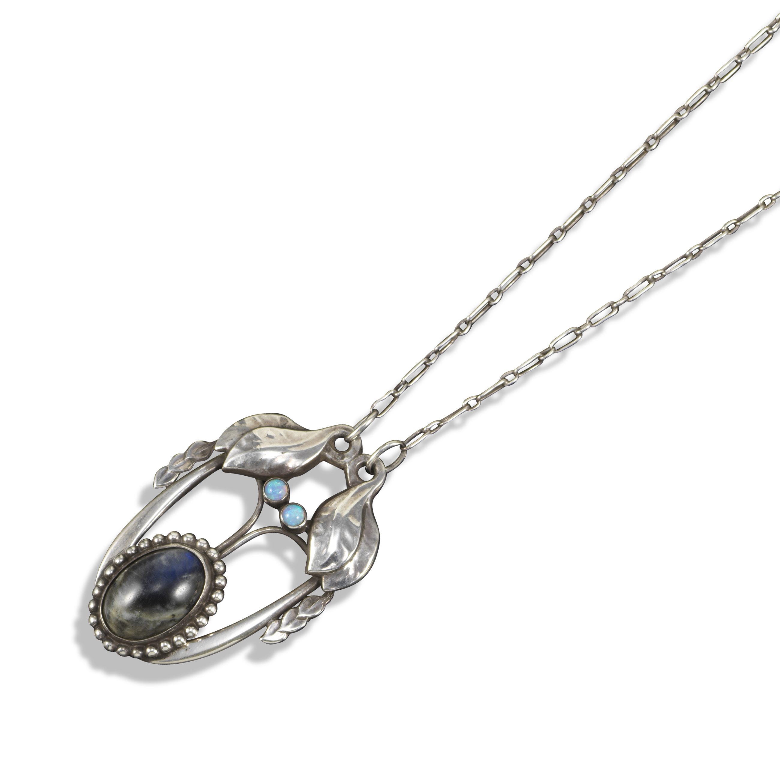 A silver and gem-set foliate pendant by Georg Jensen, design no. 4, c1904-1908, the foliate silver pendant set with an oval labradorite cabocon within a beaded border and two further opal cabochons, silver chain with spring ring clasp, stamped 826S GI, pendant 4.8cm high, chain 40cm long