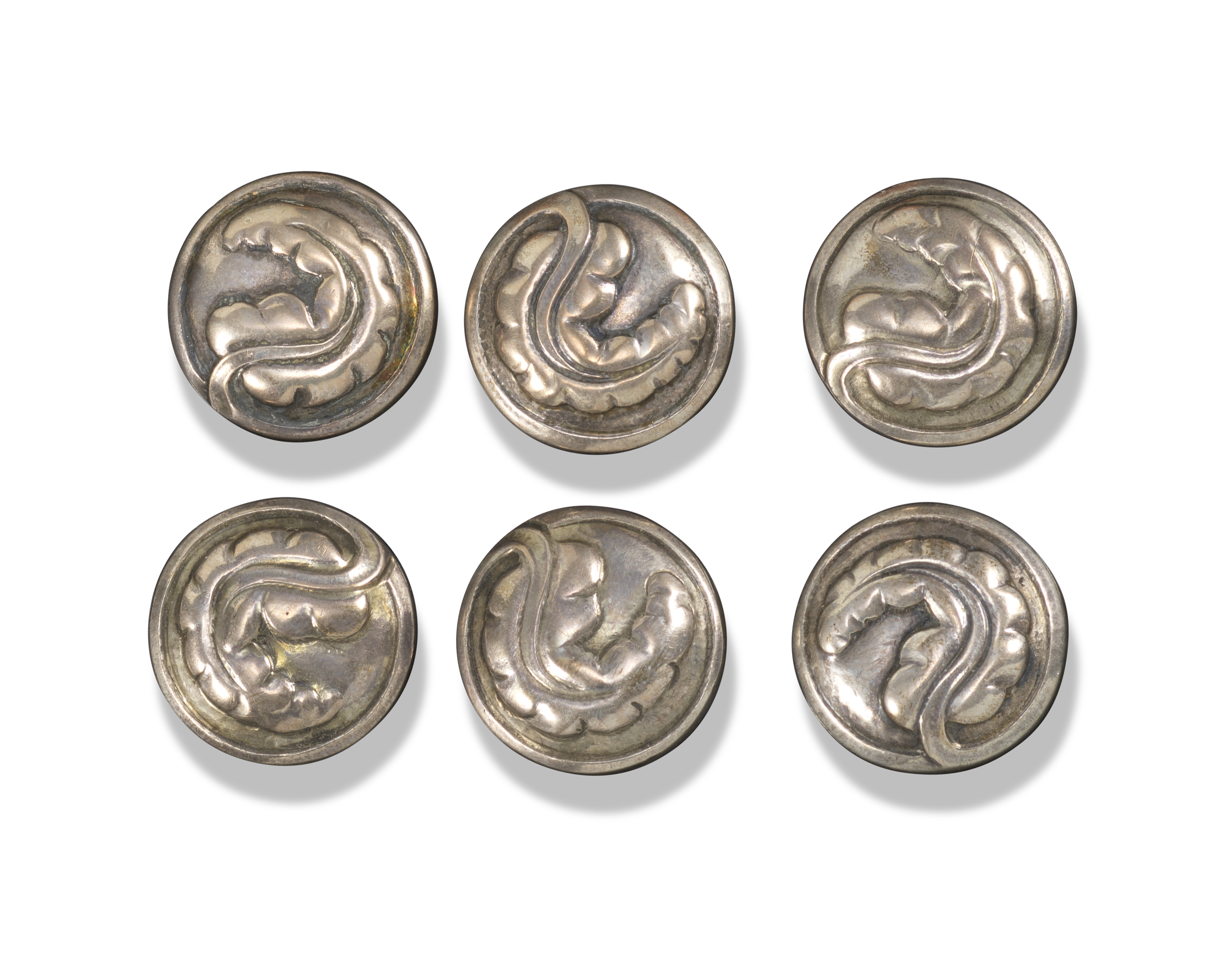 A set of six silver buttons by Georg Jensen, design no. 3, c1904-1908, each circular button with chased leaf decoration, each stamped 826 S and with maker's mark, each 2.1cm wide