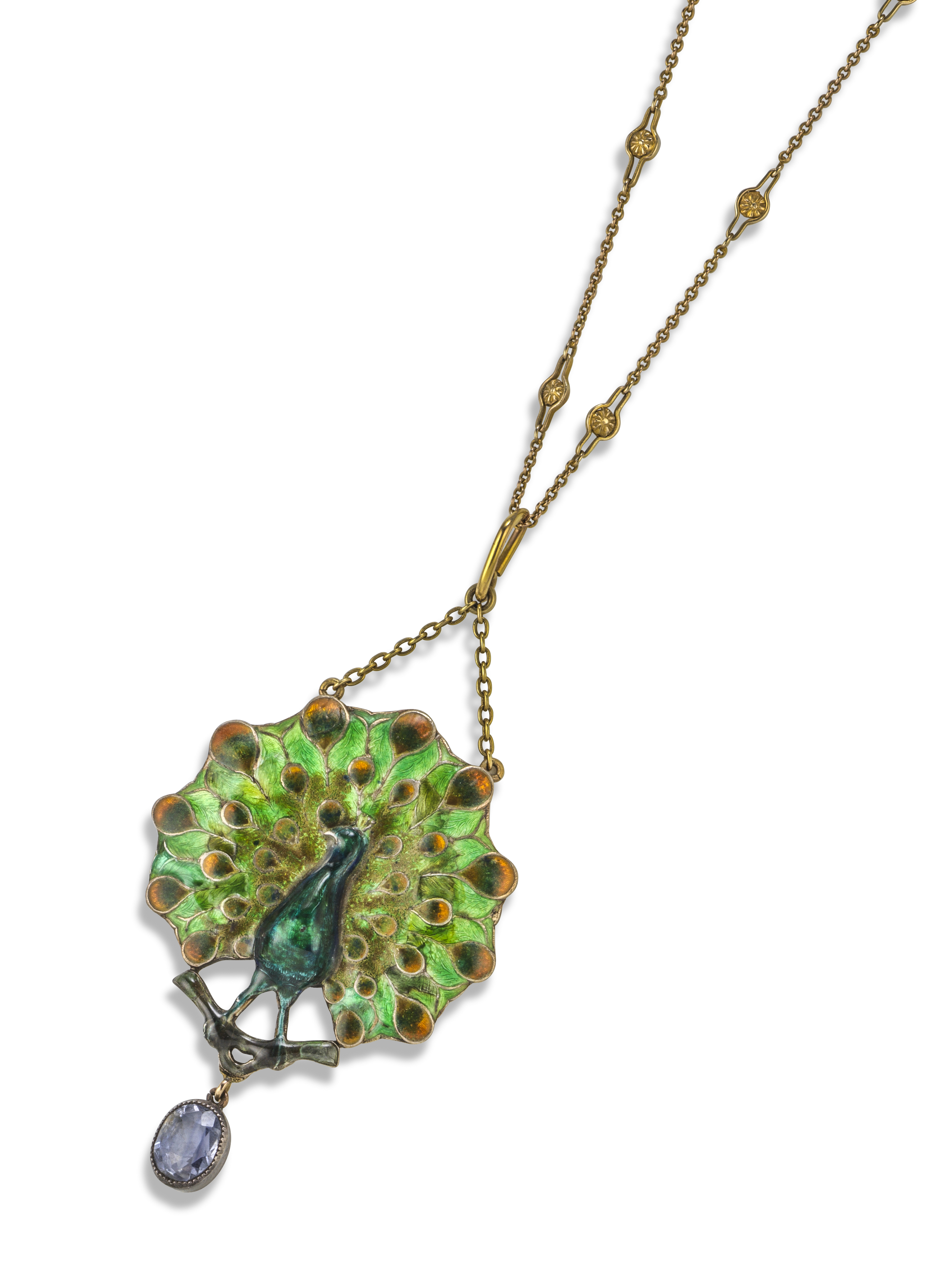 A polychrome enamel peacock pendant by Child & Child, c1905, the stylised peacock suspends a pale blue oval shaped sapphire in silver and gold, engraved decoration to reverse, maker's mark, on fancy-link neck chain, pendant 7cm high (including bale) chain 54cm long, fitted case by Child & Child
