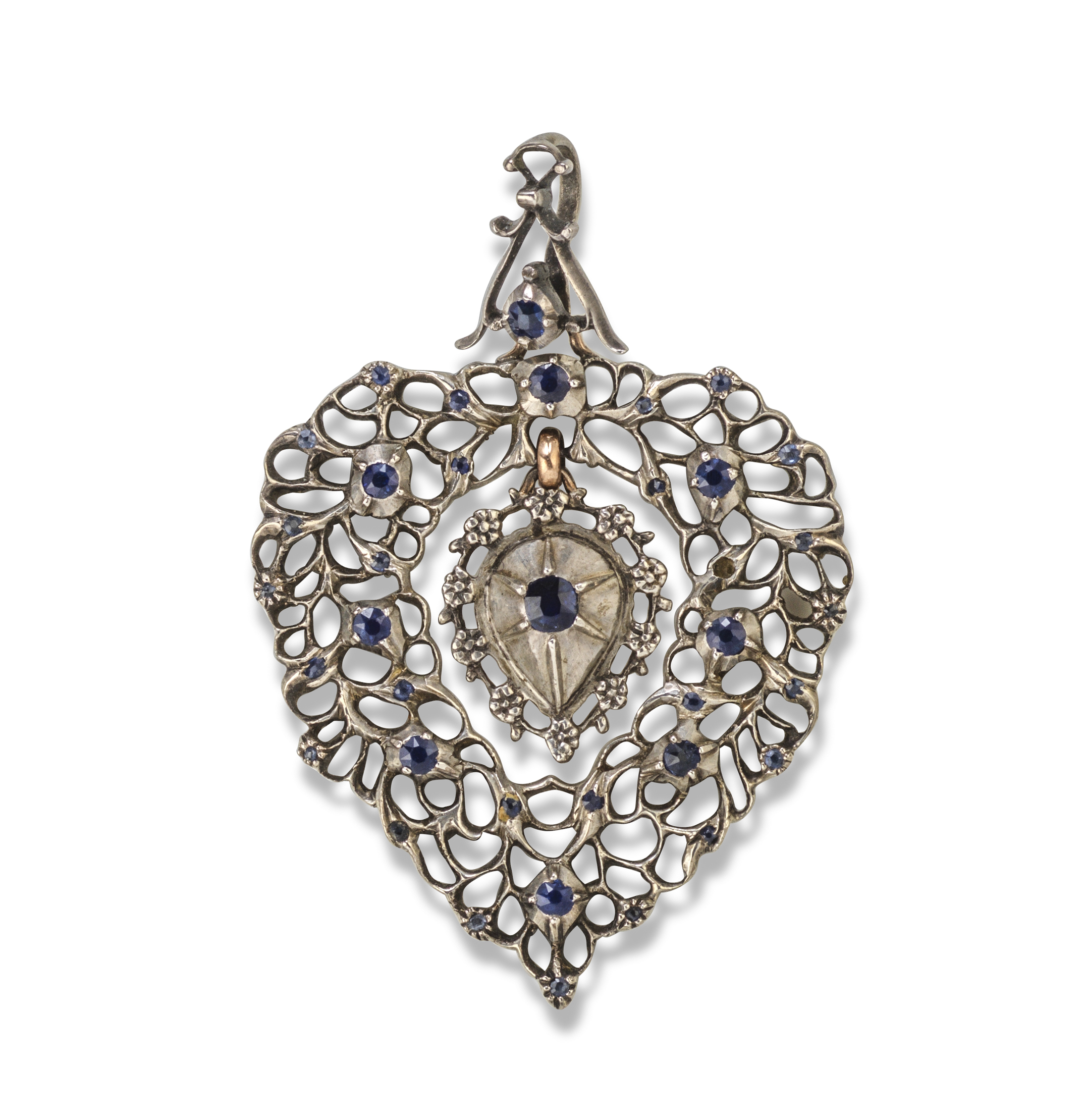 A heart-shaped openwork pendant by Child & Child, c1905, set with ten sapphires and a pear-shaped sapphire set to the articulated centre in silver and gold, maker's mark, 5.4cm high, fitted case by Child & Child