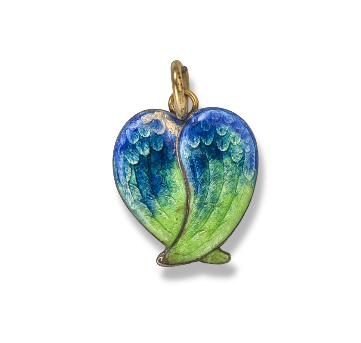 A folded wings pendant by Child & Child, c1905, decorated with shaded blue and green enamel in silver and gold, engraved to reverse and with maker's mark, 2.2cm high, Child & Child case